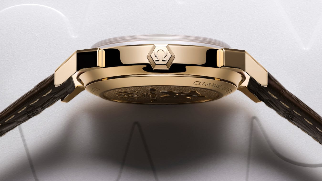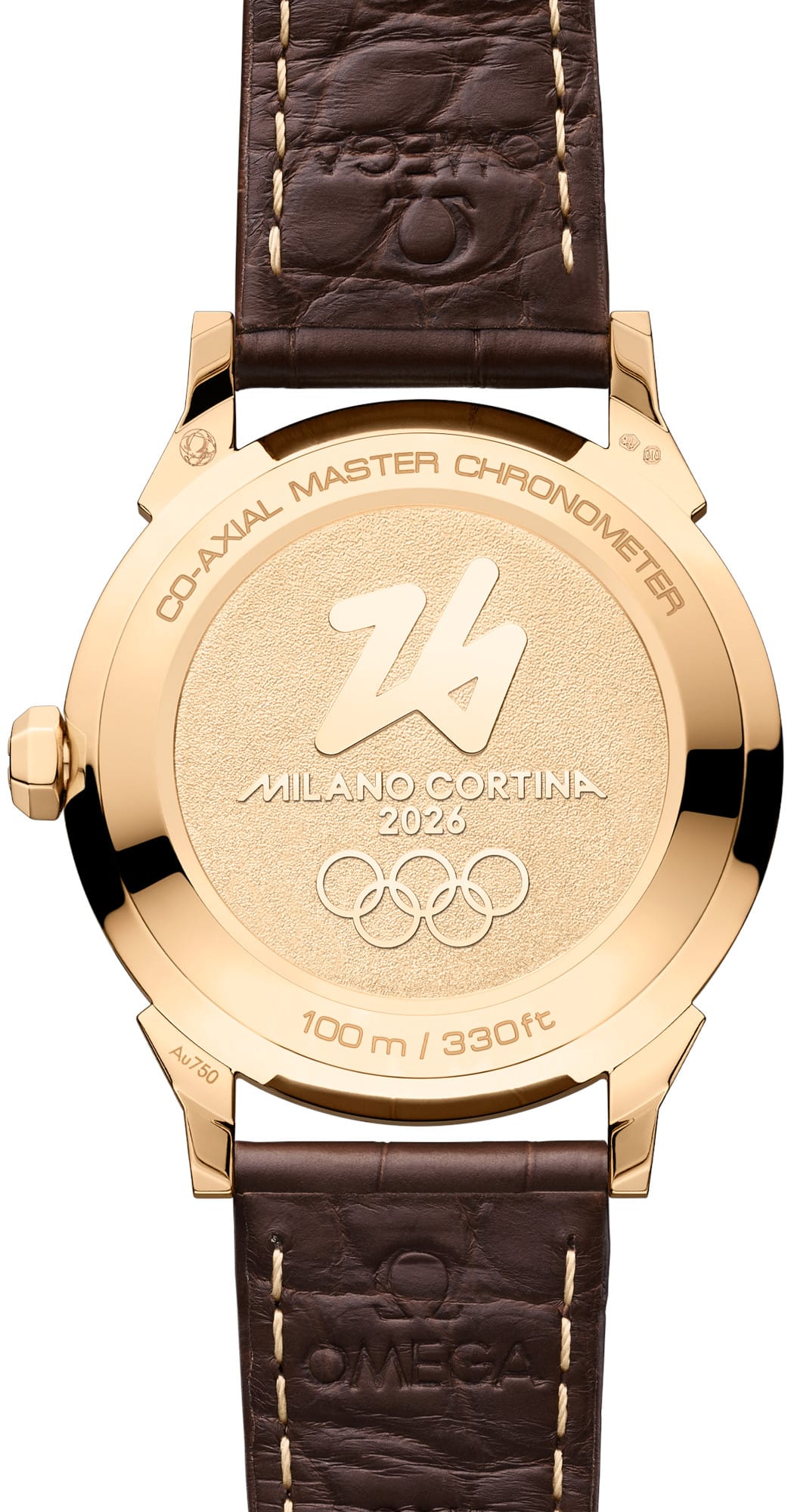 The timepiece is presented on a brown leather strap with matching leather lining and a polished 18K Moonshine™ Gold buckle. Inside, the Co-Axial Master Chronometer Calibre 8807, certified by METAS, ensures exceptional performance. The polished caseback features a special medallion commemorating Milano Cortina 2026, marking another chapter in OMEGA's remarkable Olympic timekeeping legacy.