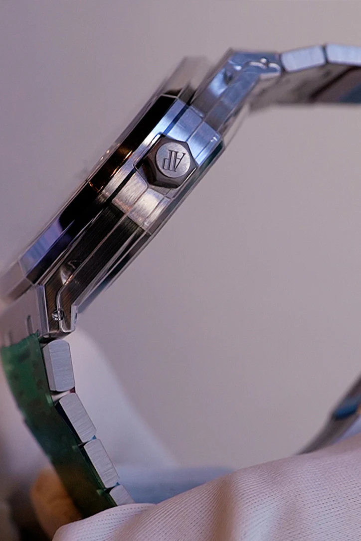 Audemars Piguet Royal Oak 41mm Khaki Green Dial 50th Anniversary Watch 15510ST.OO.1320ST.04. 41 mm Royal Oak Selfwinding in stainless steel sports the collection’s ergonomic design evolution as well as a Grande Tapisserie dial in a new khaki shade. Case 41mm Thickness 10.5 mm Water Resistance 50 m “Khaki Green” dial with “Grande Tapisserie” pattern, white gold applied hour-markers and Royal Oak hands with luminescent coating. Stainless steel bracelet with AP folding clasp Bracelet. Calibre 4302 Functions Hours, Minutes, Centre Seconds And Date. Number Of Jewels 32 Mechanism Selfwinding Power Reserve 70 H Total Diameter 32 mm Number Of Parts 257 Frequency 4 Hz 28,800 Vph Thickness 4.8 mm