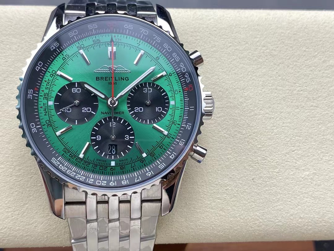 The silver-toned dial presents red gold hands, a date display at 6 o’clock, and traditional Navitimer details including three chronograph counters and baton indexes.