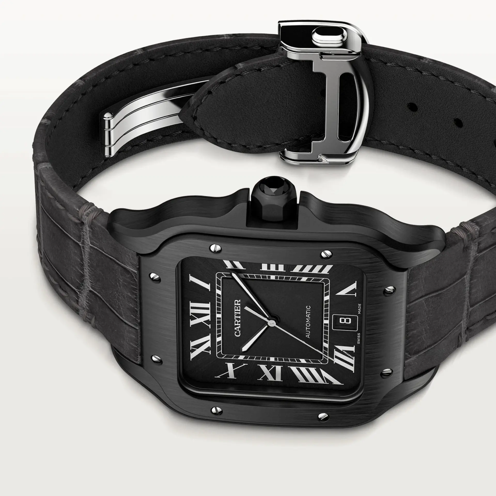 Santos de Cartier watch, large model, Manufacture mechanical movement with automatic winding, caliber 1847 MC. Bezel and case in steel and ADLC, steel crown set with a black faceted synthetic spinel, black dial, black steel sword-shaped hands with luminescent material, sapphire crystal. A rubber strap, second strap in black alligator leather, steel interchangeable deployant buckle. Both bracelets are equipped with the “QuickSwitch” interchangeability system. Case width: 39.8 mm, thickness: 9.38 mm. Water-resistant up to 10 bar (approx. 100 meters/100 feet).