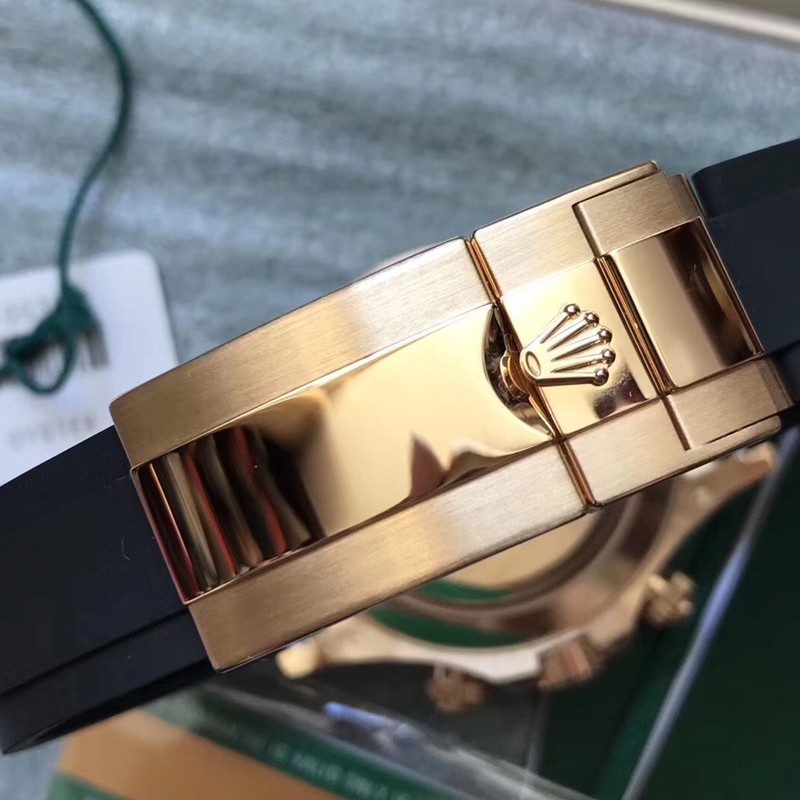 Rolex Daytona Cosmograph (116518LN) self - winding automatic watch, features a 40mm 18k yellow gold case with a black Cerachrom bezel surrounding a champagne dial on a black Oysterflex strap with a yellow gold deployant buckle.