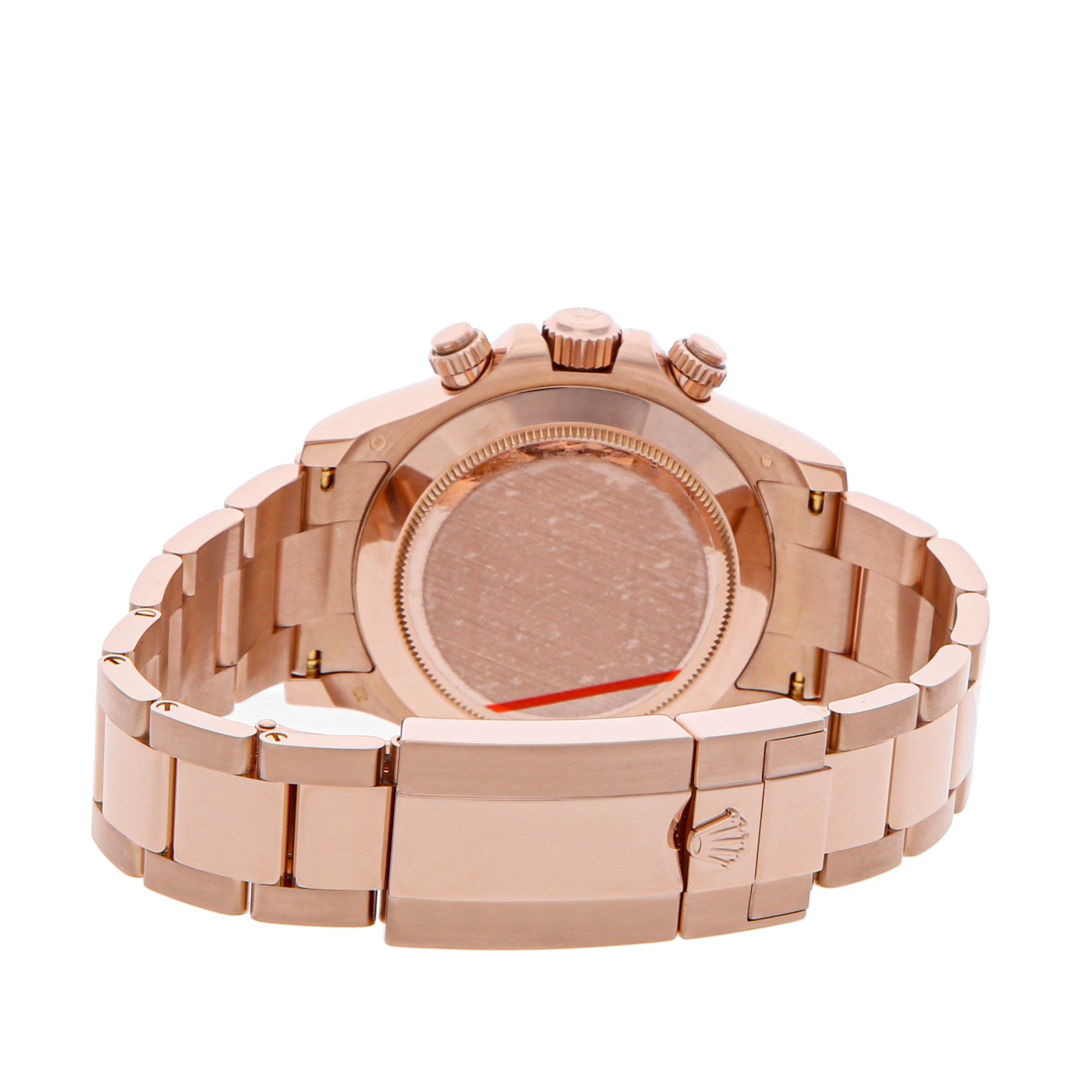 Pre-Owned Rolex Daytona Cosmograph (116505) self - winding automatic watch, features a 40mm 18k Everose gold case surrounding a pink dial on an 18k Everose gold Oyster bracelet with folding buckle. Functions include hours, minutes, small seconds, chronograph and tachymeter.This watch comes complete with box and papers.We back this watch with a 2-Year WatchBox warranty!