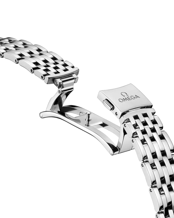This watch is presented on a stainless steel bracelet and is driven by the OMEGA Quartz Calibre 4061, with a battery life of at least 48 months.