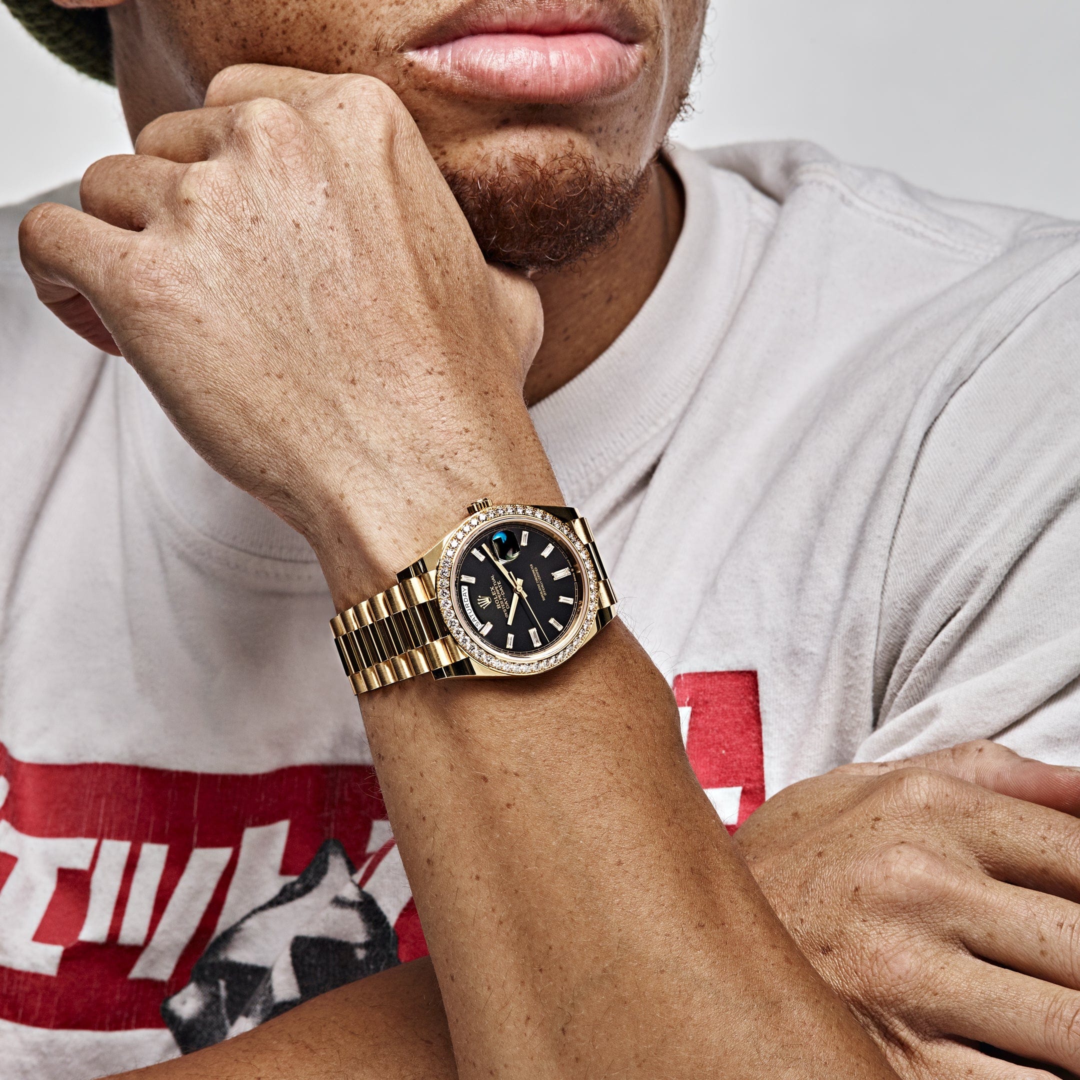 Strap material: 18k gold, President type, three-grid arched chain link
