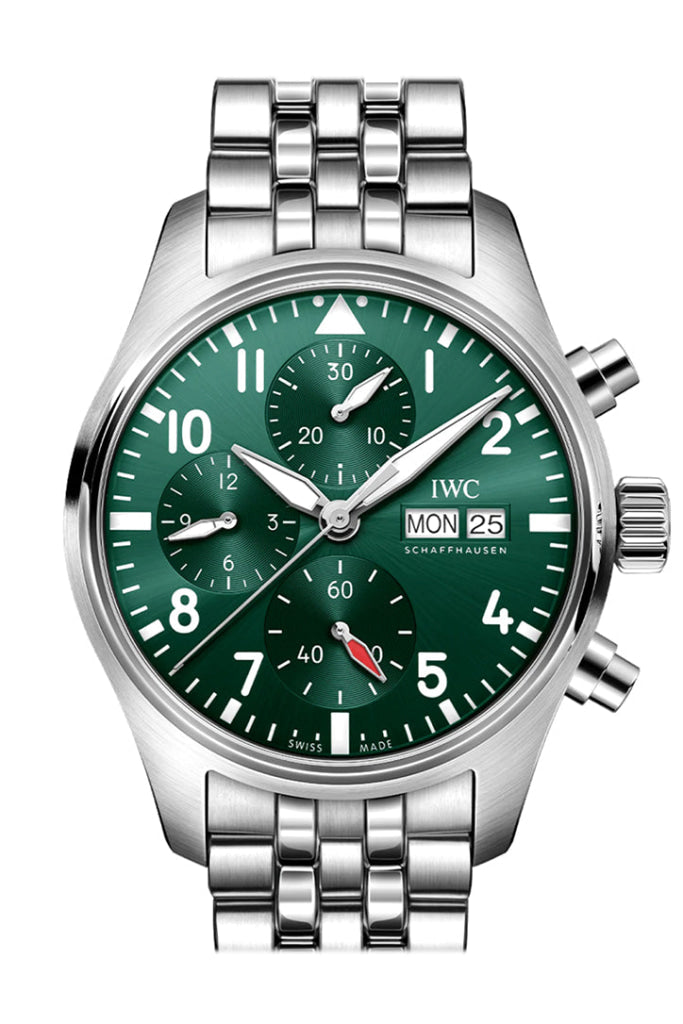 IWC Pilot Chronogragh Watch IW388104 Stainless steel case, Automatic, self-winding, Diameter 41.0 mm, Green dial with luminescence, Stainless steel bracelet with EasX-CHANGE system, Strap width 20.0 mm. Made in Switzerland