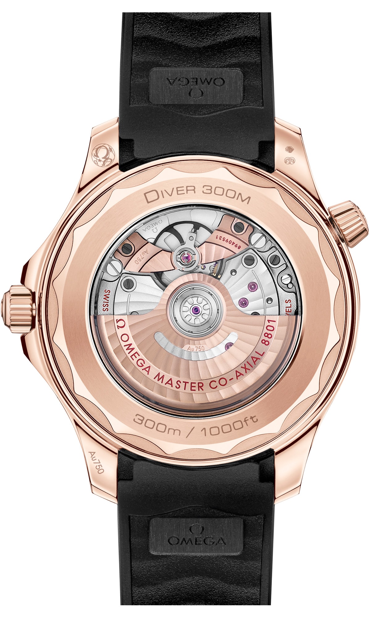 The watch is presented on a black rubber strap and is driven by the OMEGA Master Chronometer Calibre 8801, which can be seen through the sapphire-crystal on the wave-edged caseback.