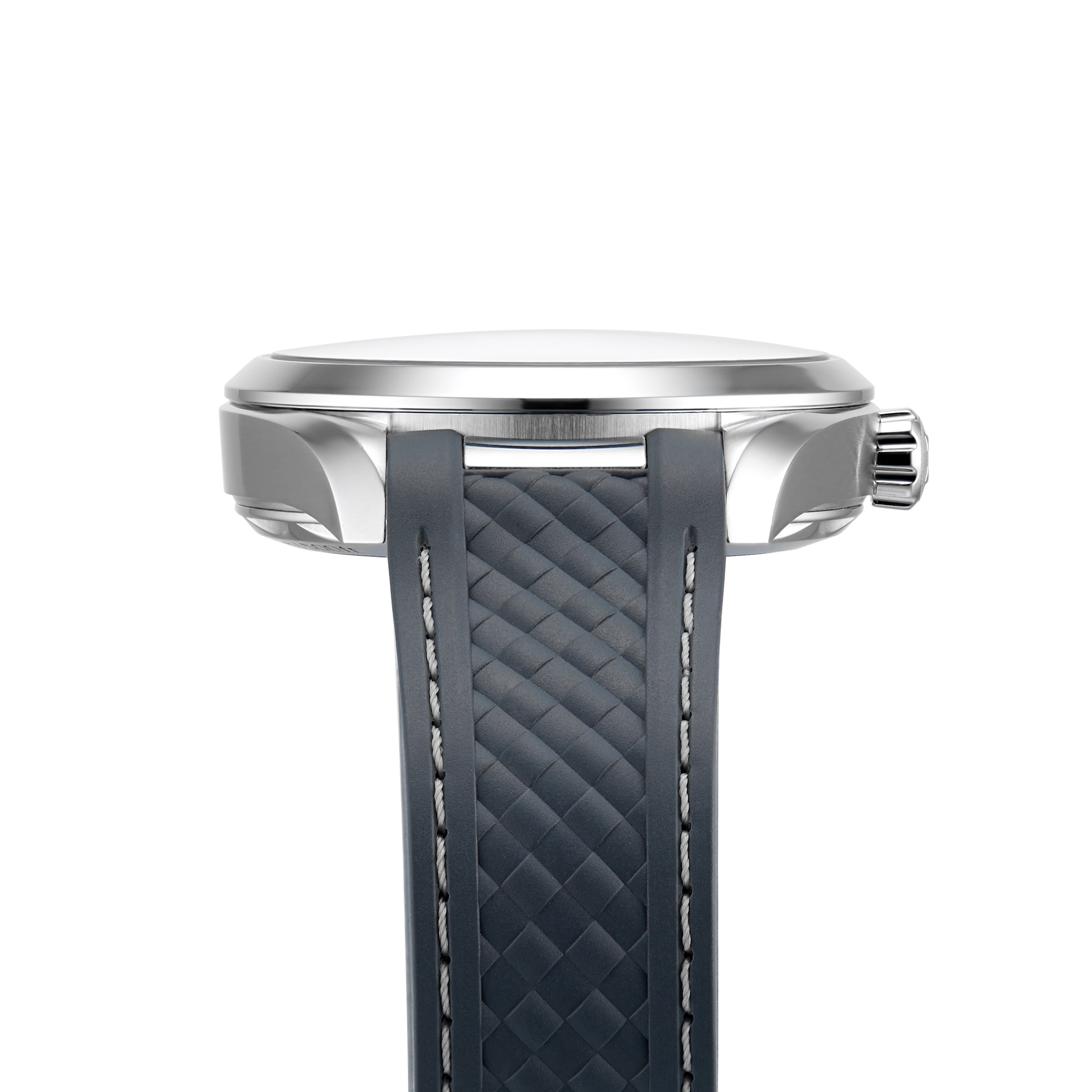 This 41mm watch is presented in a symmetrical, stainless steel case, paired with a grey, structured rubber strap.