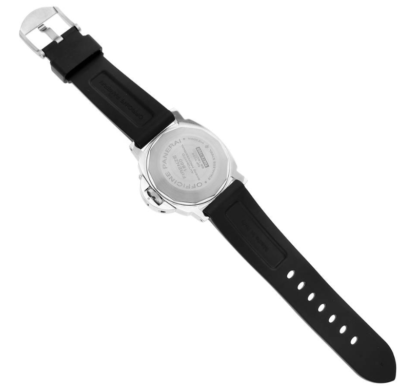 Silver-tone stainless steel case with a black rubber strap. Black dial with silver-tone hands and dot hour markers. Minute markers around the outer rim. Dial Type: Analog. Luminescent hands and markers. Date display at the 3 o'clock position. One- small seconds subdials. Panerai Calibre OP XXX automatic movement with a 50-hour power reserve. Scratch resistant sapphire crystal. Screw down crown. Solid case back. Case size: 44 mm. Round case shape. Band width: 22 mm. Water resistant at 300 meters / 1000 feet. Functions: date, hour, minute, second. Luxury watch style. Watch label: Swiss Made. Panerai Luminor Submersible Automatic Mens Watch PAM01024