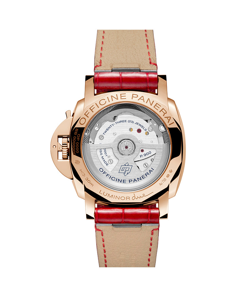 "Panerai Piccolo Due MadrePerla, Automatic mechanical, P.900 calibre, 12 _ lignes, 4.2 mm thick, 23 jewels, 28,800 alternations/hour. Incabloc¨ anti-shock device. Power reserve 3 days, one barrel. 171 components. Functions- Hours, minutes, small seconds, date. Case-Diameter 38mm, polished Goldtechª. Bezel-