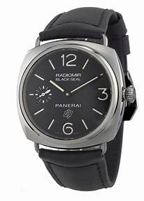 Silver-tone stainless steel case with a black leather strap. Fixed silver-tone stainless steel bezel. Black dial with black hands and Arabic numeral and index hour markers. Dial Type: Analog. Luminescent hands and markers. One - small seconds subdial. P.6000 Calibre automatic movement. Scratch resistant sapphire crystal. Solid case back. Cushion case shape. Case size: 45 mm. Water resistant at 100 meters / 330 feet. Functions: hour, minute, second. Dress watch style. Watch label: Swiss Made. Panerai Radiomir Black Seal Automatic Black Dial Mens Watch