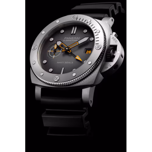 Degradé anthracite with luminous hour markers and dots. Date at 3 o’clock, small seconds at 9 o’clock