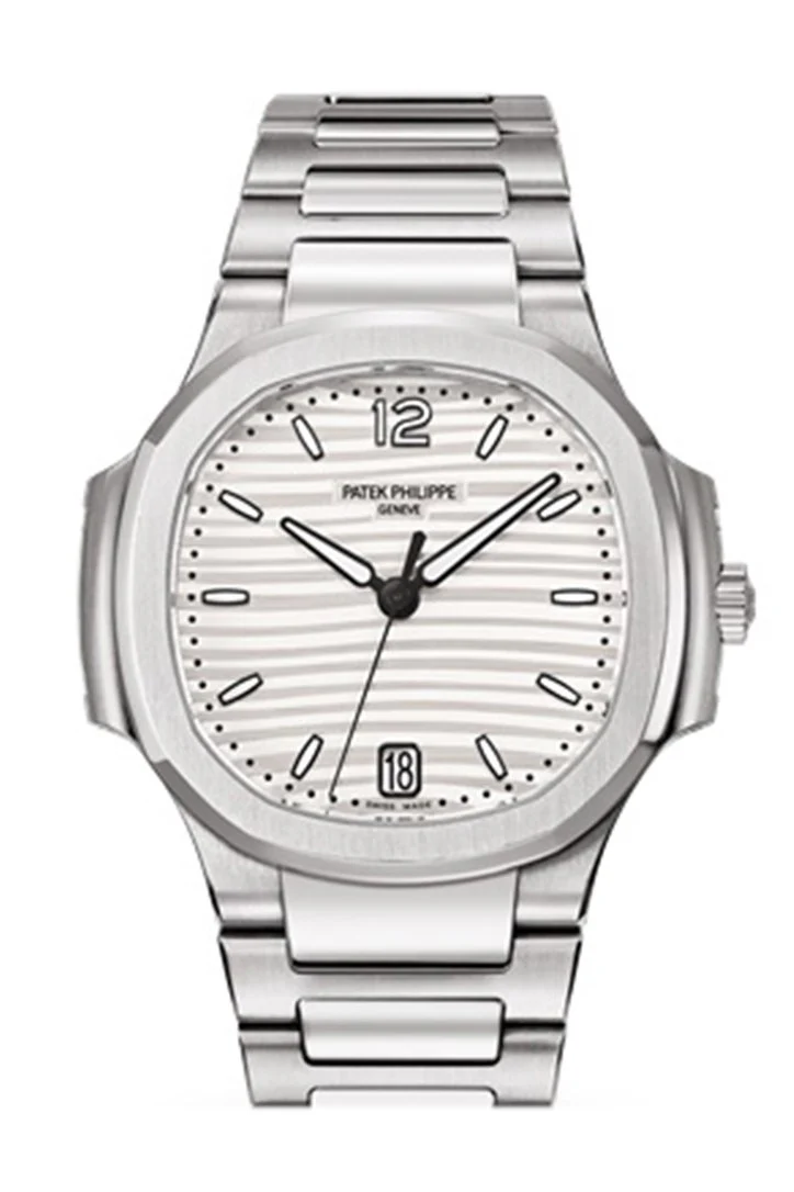Stainless steel case with a stainless steel bracelet. Fixed stainless steel bezel. Silver opaline dial with luminous silver-tone hands and index hour markers. An Arabic numeral appears at the 12 o'clock postion. Minute markers around the outer rim. Dial Type: Analog. Luminescent hands and markers. Date display at the 6 o'clock position. Patek Philippe calibre 324 S C automatic movement with a 45-hour power reserve. Scratch resistant sapphire crystal. Solid case back. Cushion case shape. Case size: 35.2 mm. Fold over clasp with a safety release. Water resistant at 60 meters / 200 feet. Functions: date, hour, minute, second. Luxury watch style. Watch label: Swiss Made. Patek Philippe Nautilus Automatic Blue Opaline Dial Ladies Watch 7118/1A 7118-aA