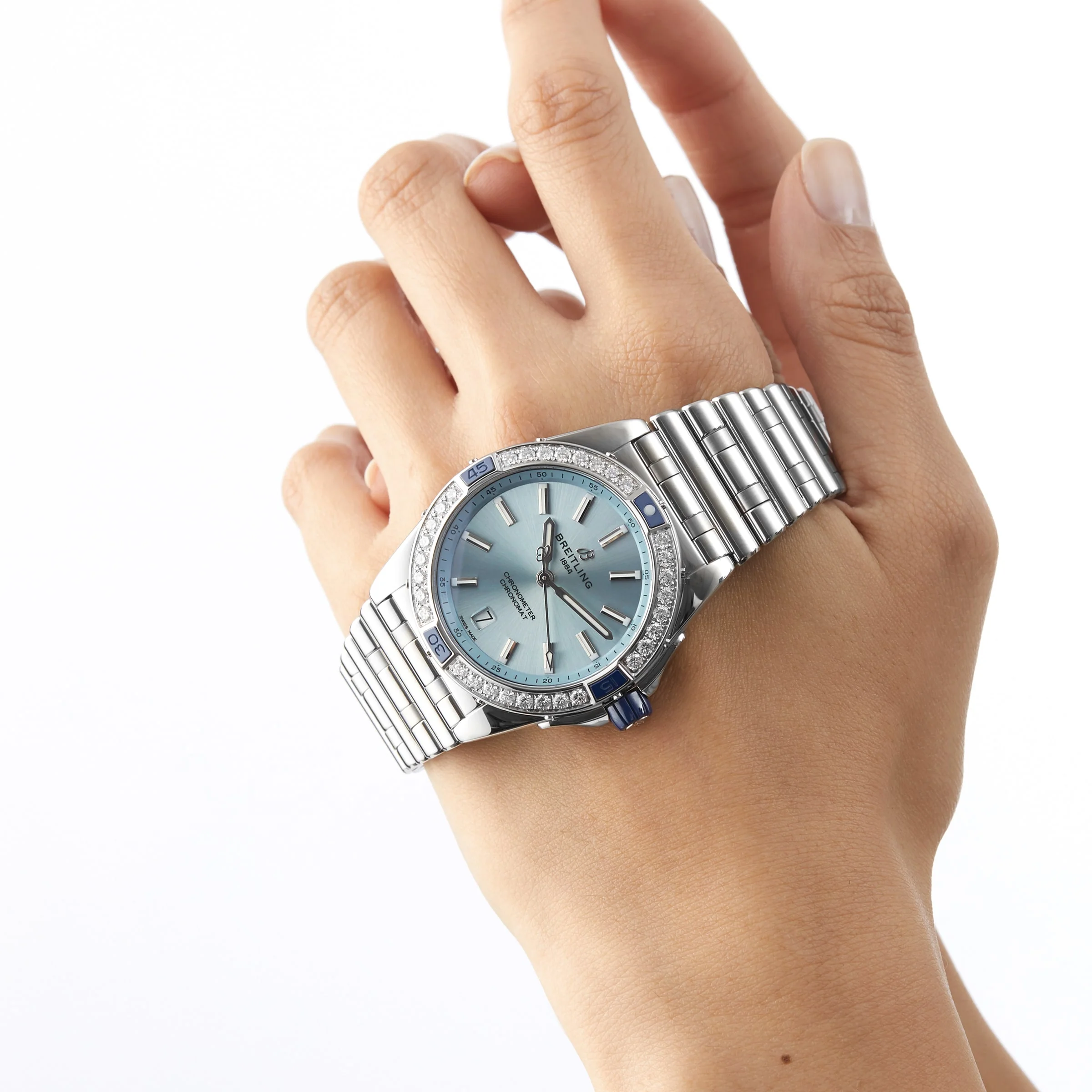Super Chronomat - inspired by the original 1980s Chronomat created for aerobatic squadrons The boldest of all Chronomat timepieces Ceramic inserts on the bezel, chronograph pushers, and crown Stainless steel bezel set with glistening diamonds for a radiant touch Powered with precision by the Breitling 17 calibre movement INSPIRED BY THE ORIGINAL CHRONOMAT The Chronomat was first introduced in 1984, bravely going against the trend of the day for extra-thin quartz timepieces, and instead presenting a robust, impressively proportioned mechanical watch. And it's a risk that paid off - the model proved a popular celebration of Breitling's centenary and hailed the return of the mechanical chronograph to prominence. The Super Chronomat is the boldest model in this collection, featuring ceramic inserts on the bezel, chronograph pushers, and the crown, alongside a Rouleaux bracelet for an enhanced sense of style. THE BOLDEST OF THEM ALL The boldest of them all, this Chronomat timepiece showcases an ice blue dial framed by glistening bezel set with radiant, oversized lab-grown diamonds. Housing a powerful Breitling 17 calibre movement, the 38mm stainless steel case is presented on a steel rouleaux bracelet. Water resistance to 10 bar (100 meters) and a 38-hour power reserve ensure flawless performance.