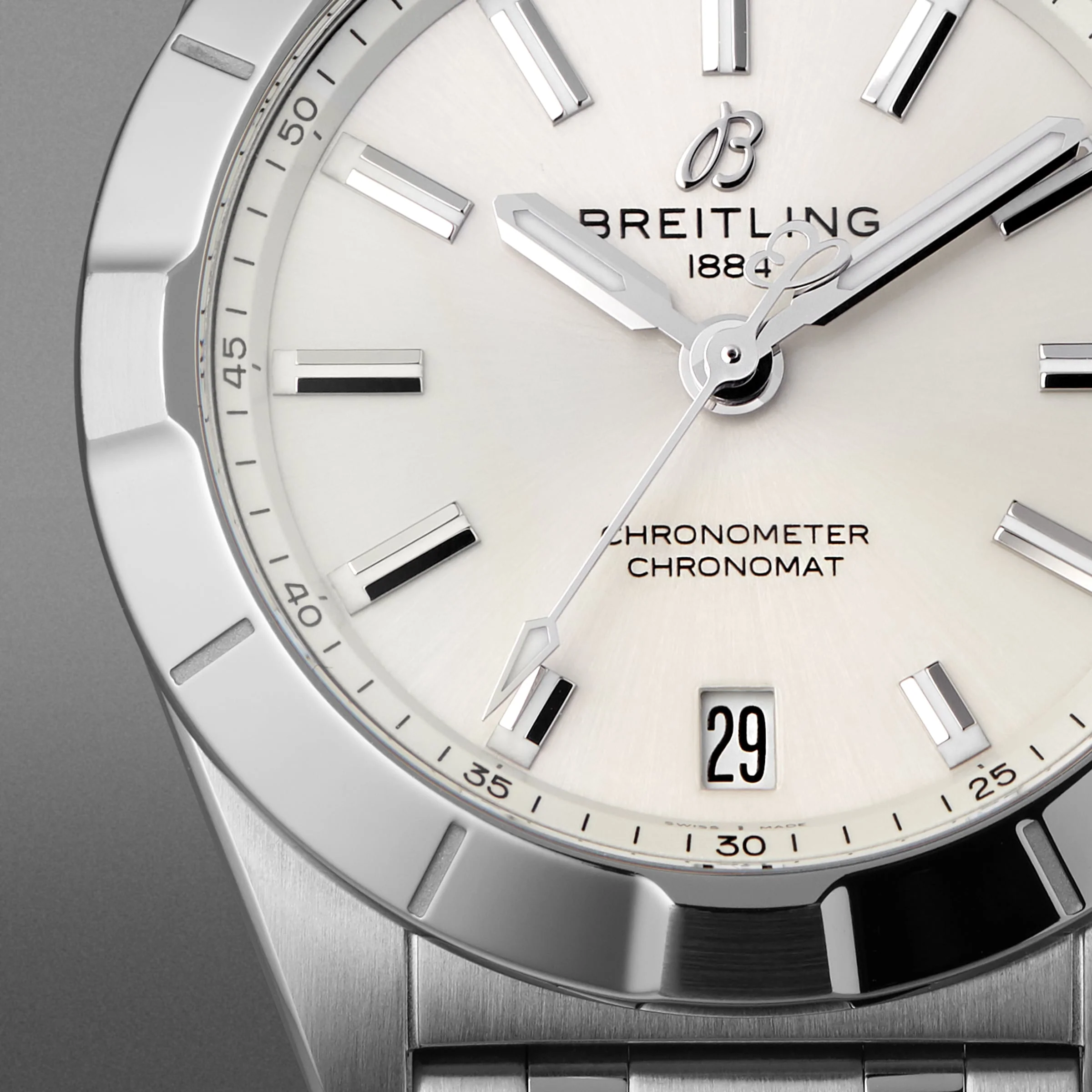 The Chronomat - Inspired by style and elegance Glistening diamond hour markers 32mm stainless steel case with the iconic Rouleaux bracelet Powered by the Breitling 77 calibre movement – a COSC-certified SuperQuartz™ chronometer Water resistant to 10 bar (100 metres) SPORTY YET CHIC Embracing sporty yet chic design elements, the Chronomat collection is inspired by style and elegance. Featuring an array of vibrant dials, straps, and bracelets, all timepieces within the range are certified chronometers recognised by the COSC. This Chronomat Automatic 32 is characterised by the iconic Rouleaux bracelet with its butterfly clasp. REFINED ELEGANCE This refined model boasts a 32mm stainless steel cased teamed with a polished stainless steel bracelet. The silver-tone dial features minimalist silver-tone batons and hour markers, as well as a date display window positioned at 6 o‘clock. The Breitling 77 calibre movement, a COSC-certified SuperQuartz™ chronometer, provides precision and reliability, while water resistance to 10 bar (100 metres) further enhances performance.