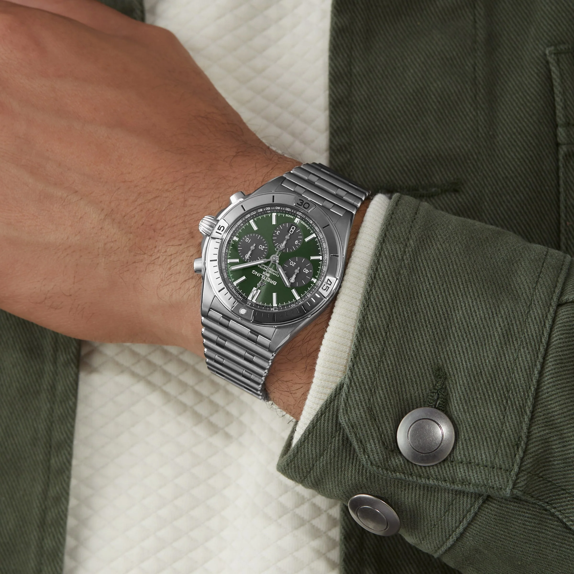 42mm in size and crafted in titanium - which is a first for this collection this year - this piece of course, includes the iconic rider tabs to protect the sapphire crystal and is equipped with the Rouleaux bracelet, which is also in titanium. With a green dial and anthracite subdials, this exclusive houses the B01 Manufacture Calibre, that can be seen through the open caseback along with a special engraving of ‘One of 100’ and our Centenary years. Limited to 100 pieces worldwide, the Breitling Chronomat Titanium perfectly embodies the brand’s entire philosophy and mission, celebrating not only 100 years of Watches of Switzerland but also 140 years of Breitling and watchmaking excellence.