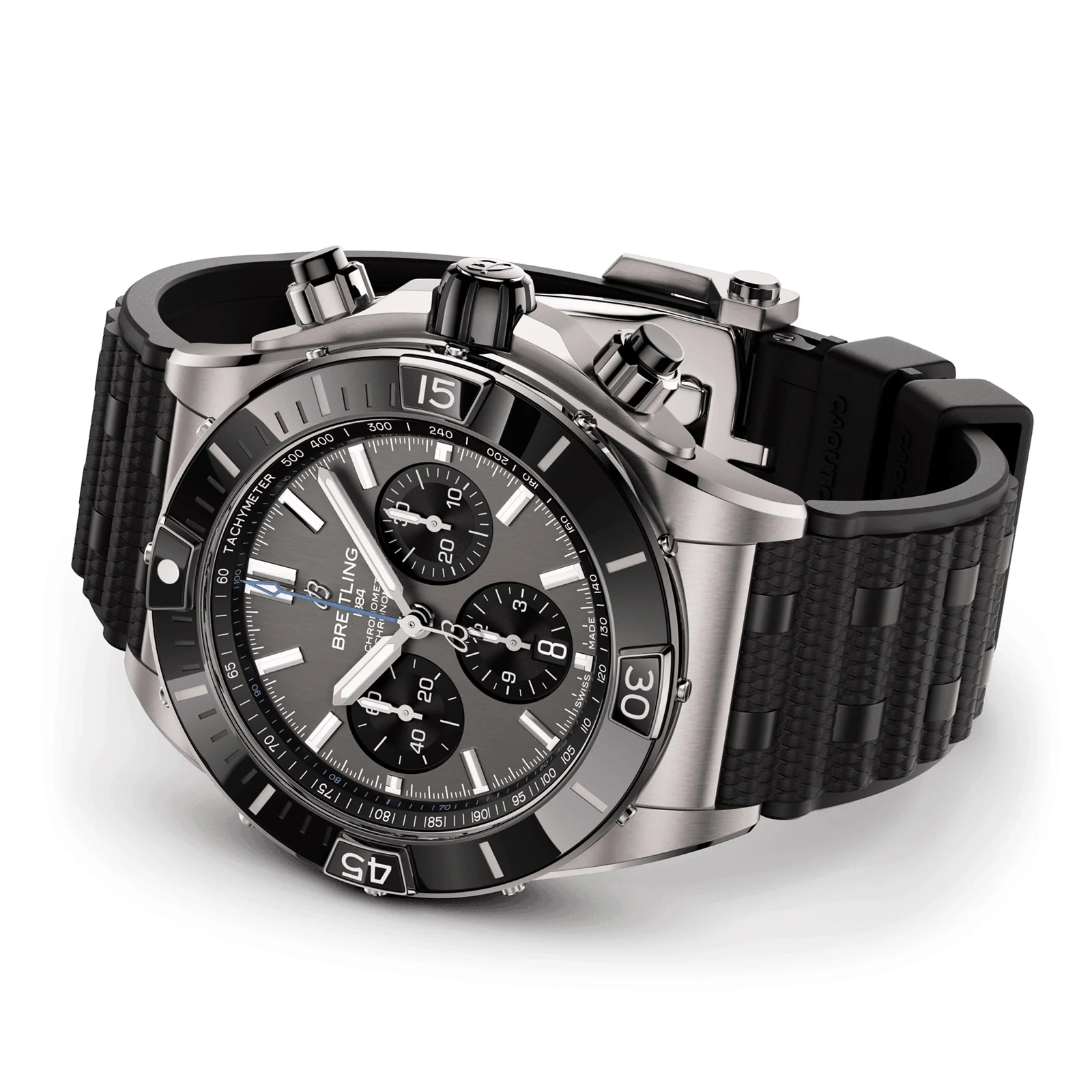 Inspired by style and elegance Presented in a 44mm titanium case and black rubber strap Water resistance to 20 bar (200 metres) Grey dial with tachymeter function Powered by Breitling Manufacture 01 calibre movement THE CHRONOMAT COLLECTION Combining distinct elements of sports with chic design, the Chronomat models are a versatile collection inspired by style and elegance. Featuring an array of vibrant dials, straps, and bracelets, all timepieces within the range are certified chronometers recognised by the COSC. THE ULTIMATE SPORTS WATCH A grey dial is home to baton hour markers, luminescent hands, three sub-dials, a vibrant blue seconds hand, and a tachymeter scale. A unidirectional bezel frames this 44mm titanium Super Chronomat model, which is presented on a black rubber strap. This timepiece is complete with Breitling Manufacture 01 calibre movement.