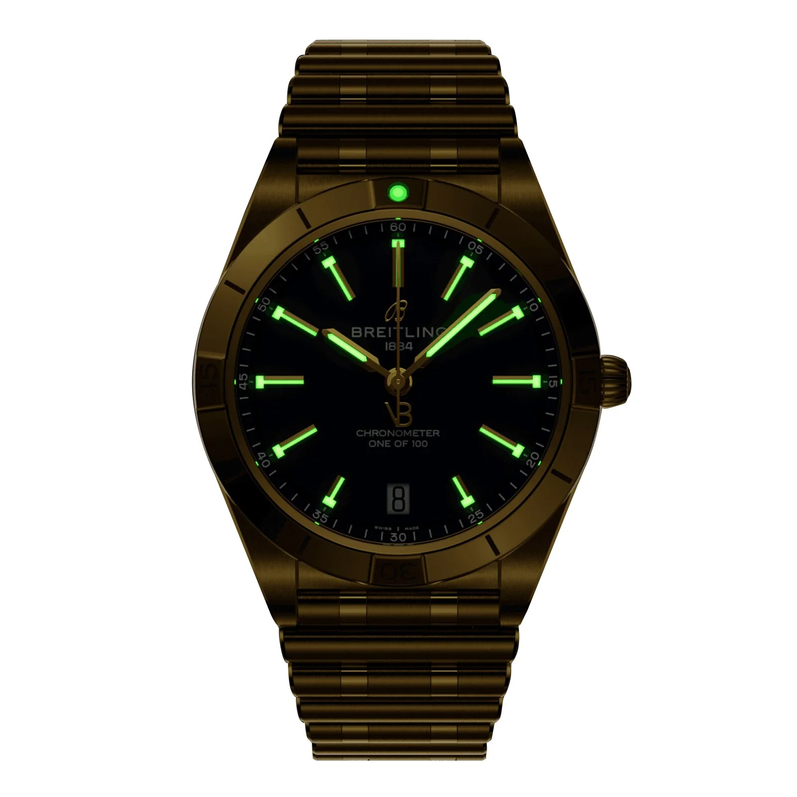 Chronomat - An all-purpose watch A limited edition collaboration with Victoria Beckham Presented in a 36mm 18K yellow gold case with a co-ordinating rouleaux bracelet Rich midnight blue dial creates a beautiful contrast against the yellow gold Collection limited to 1,500 pieces UNAPOLOGETIC CONFIDENCE Pairing distinctly retro elements with touches of modern luxury, the Chronomat Automatic ladies collection offers a range of timepieces to suit every occasion. A limited edition collaboration with Victoria Beckham, this model combines Breitling's timeless craftmanship with the fashion-house creative director's sophisticated yet playful blend of feminine and masculine influences. As well as preserving classic Chronomat design elements, such as the metal rouleaux bracelet and raised rider tabs at the 15-minute marks, the collection features colourways inspired by Victoria Beckham's Spring/Summer 2024 palette - peppermint, midnight blue, dove grey, and sand. SOPHISTICATED YET PLAYFUL Beautifully presented in a 36mm 18K yellow gold case, this stylish timepiece is driven by the COSC-certified Breitling 10 self-winding mechanical movement. The rich blue dial showcases sleek baton hour markers and hands, with a subtle date window at 6 o'clock. 'One of 100' is inscribed on the dial, referencing the limited nature of this collaboration. Secured with the iconic Chronomat rouleaux bracelet, this luxurious timepiece offers water resistance up to 10 bar (100 metres) and a 42-hour power reserve. For women who embrace authenticity and unapologetic confidence.
