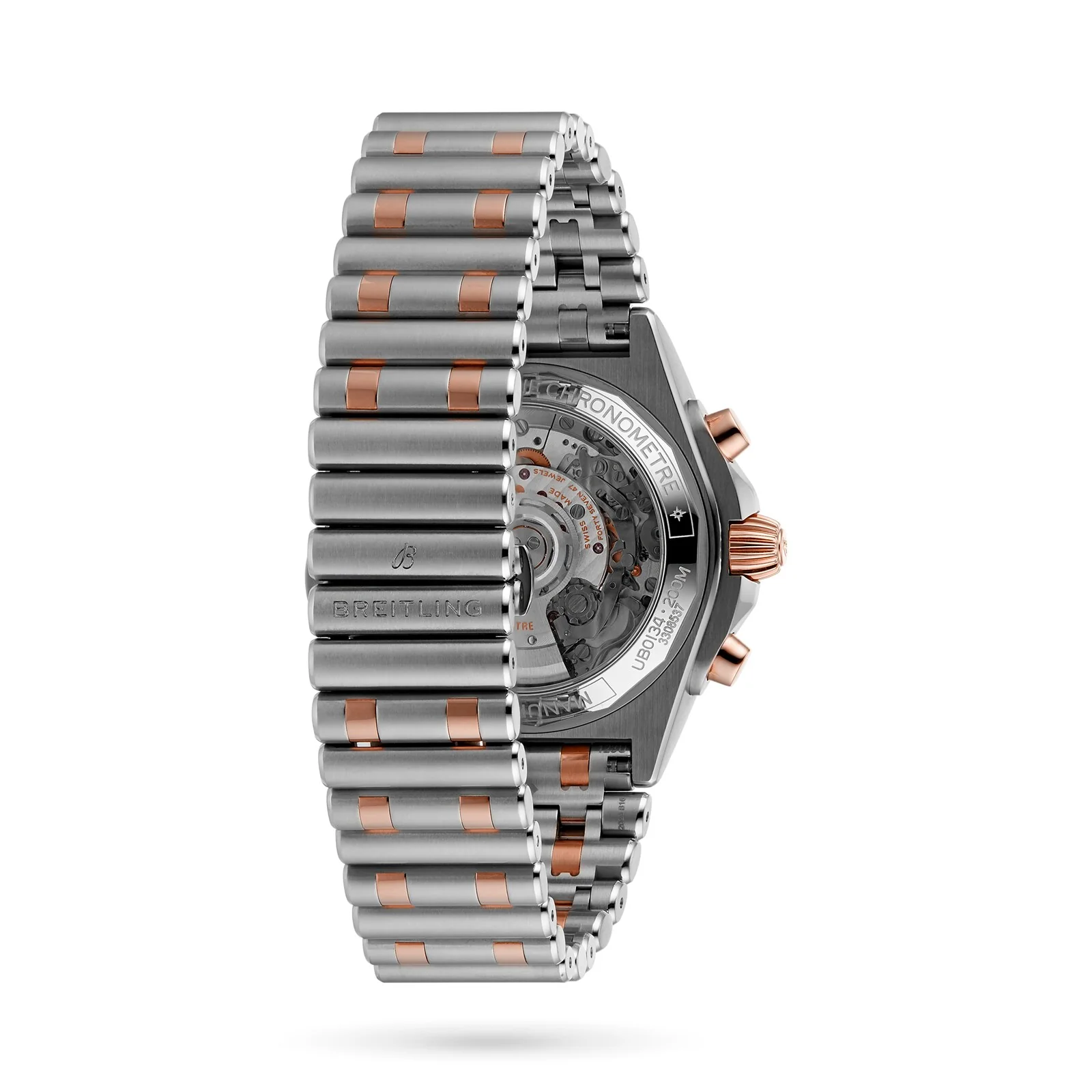 A mechanical timepiece inspired by style and elegance Chronomat heritage to confidently handle any pursuit Grey dial framed by an iconic bezel with four rider tabs 42mm 18K red gold and stainless steel case with a co-ordinating Rouleaux bracelet Powered by the Breitling 01 COSC certified calibre movement AN ICONIC DESIGN The Chronomat was first introduced in 1984, bravely going against the trend of the day for extra-thin quartz timepieces, and instead presenting a robust, impressively proportioned mechanical watch. And it’s a risk that paid off – the model proved a popular celebration of Breitling’s centenary and hailed the return of the mechanical chronograph to prominence. This Chronomat B01 42 is characterised by a robust, stainless steel case, the iconic bezel with four rider tabs, and the signature Rouleaux bracelet. OPTIMUM PERFORMANCE An elegant stainless steel and 18K red gold bracelet presents the 42mm case, featuring an iconic bezel with four rider tabs. The grey dial features silver-tone hands and indexes, three sub- dials, a date display, and subtle yet striking red details. For optimum performance, this timepiece is powered by the Breitling 01 calibre movement, certified by the COSC.