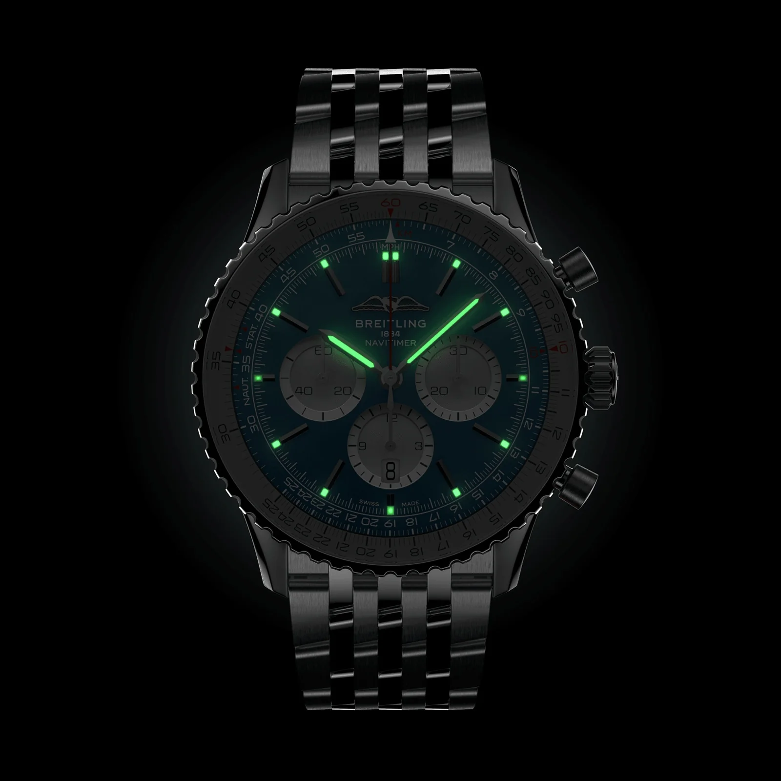 Navitimer – a staple of sophistication and elegance A re-imagined design, retaining the timepiece’s iconic elements 46mm case with a blue dial and trio of chronograph counters B01 Chronograph movement with 70 hours of power reserve Water resistant up to 3 bars (30 metres) AVIATION HERATIGE A modern take on Breitling’s original beloved pilot’s watch, the Navitimer B01 Chronograph is a vision of classic excellence. Honouring the legend of a timepiece that not only adorned the wrists of pilots for over 70 years, but also accompanied astronauts into space and joined the biggest stars on earth on the red carpet. Preserving the classic features of the model with refined modern enhancements, this timepiece is a model of understated quality and precision timekeeping. A compact profile, alternating polished and brushed finishes, and unmistakable dials featuring 3 chronograph counters, create an elegant addition to the Navitimer family. ICONIC DETAILS This Navitimer timepiece features a 46mm stainless steel case with a notched bezel for easy grip. The blue dial is contrasted with handsome stainless steel baton indexes, and a discreet date window sitting at the 6 o’clock position. The iconic AOPA wings return to their original 12 o’clock position for a hint of nostalgia, with an open-caseback allowing for an uninterrupted view of the COSC-certified Breitling 01 calibre movement. The timepiece features an integrated seven- row stainless steel bracelet and a sapphire crystal domed case for optimal comfort and clarity.