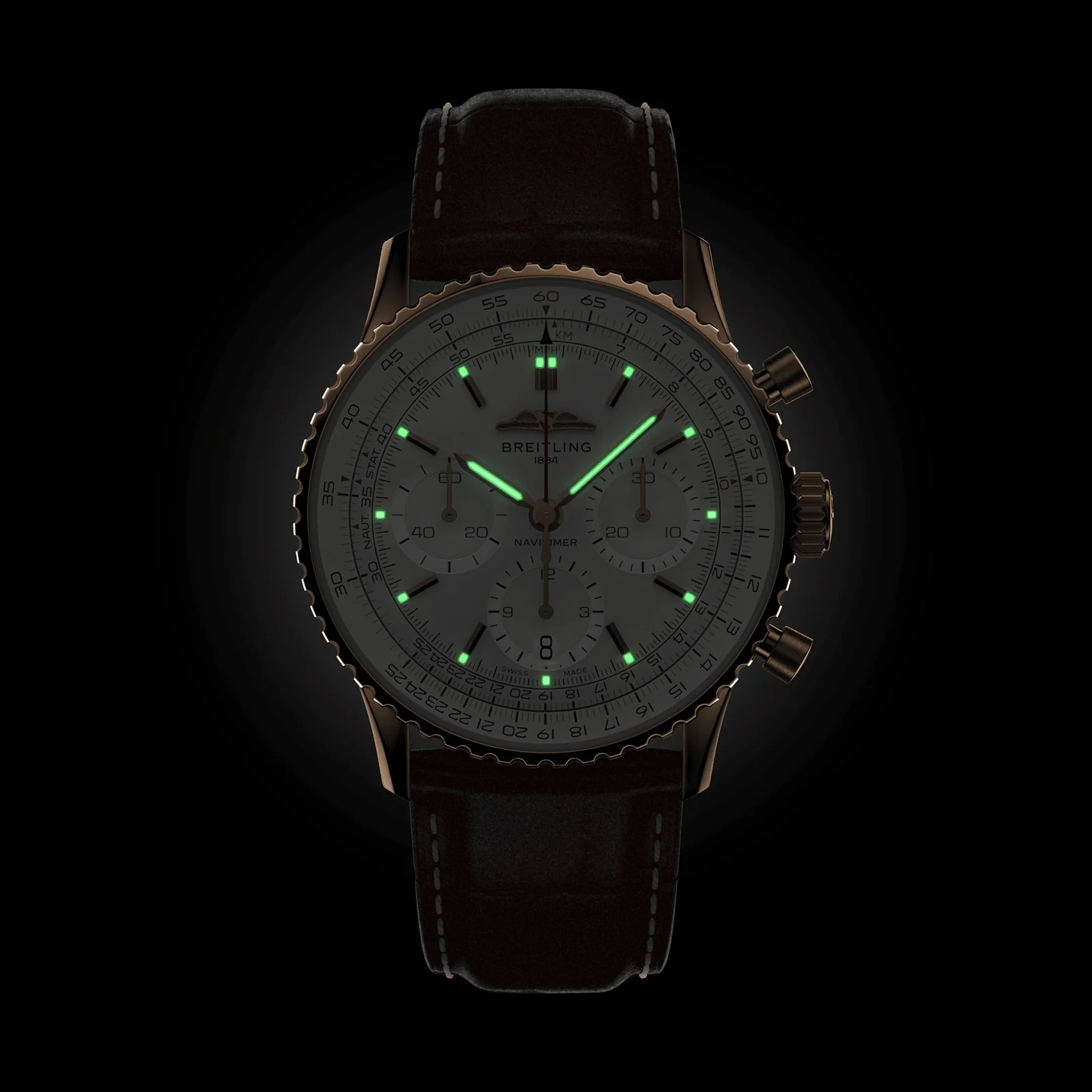 A new take on the iconic Navitimer timepiece Embraces classic design with modern refinements Silver-tone dial with baton indexes and chronograph counters 41mm stainless steel case and bracelet Powered by Breitling 01 calibre movement AN ICONIC PILOT’S WATCH First introduced in 1952, the navigation timer, or the Navitimer, was designed to allow pilots to perform all necessary flight calculations in the sky. Two years later, it was named the official timepiece of the Aircraft Owners and Pilots Association – the largest pilot’s club in the world. Staying true to the iconic collection, this new Navitimer B01 Chronograph is enhanced by modern refinements, namely a sleeker profile, as well as brushed and polished metal elements for a luxe yet somehow understated finished. A nostalgic nod to the original design, the model features the AOPA wings at the original position of 12 o’clock. BETTER THAN THE REST Presented on a brown leather strap, this 41mm model features an 18K red gold case framed by a notched bezel, a crown, and two gaskets. The understated dial presents iconic Navitimer details such as red gold baton indexes and chronograph counters alongside red gold hands. Complete with Breitling 01 calibre movement, this powerful chronometer is certified by COSC.