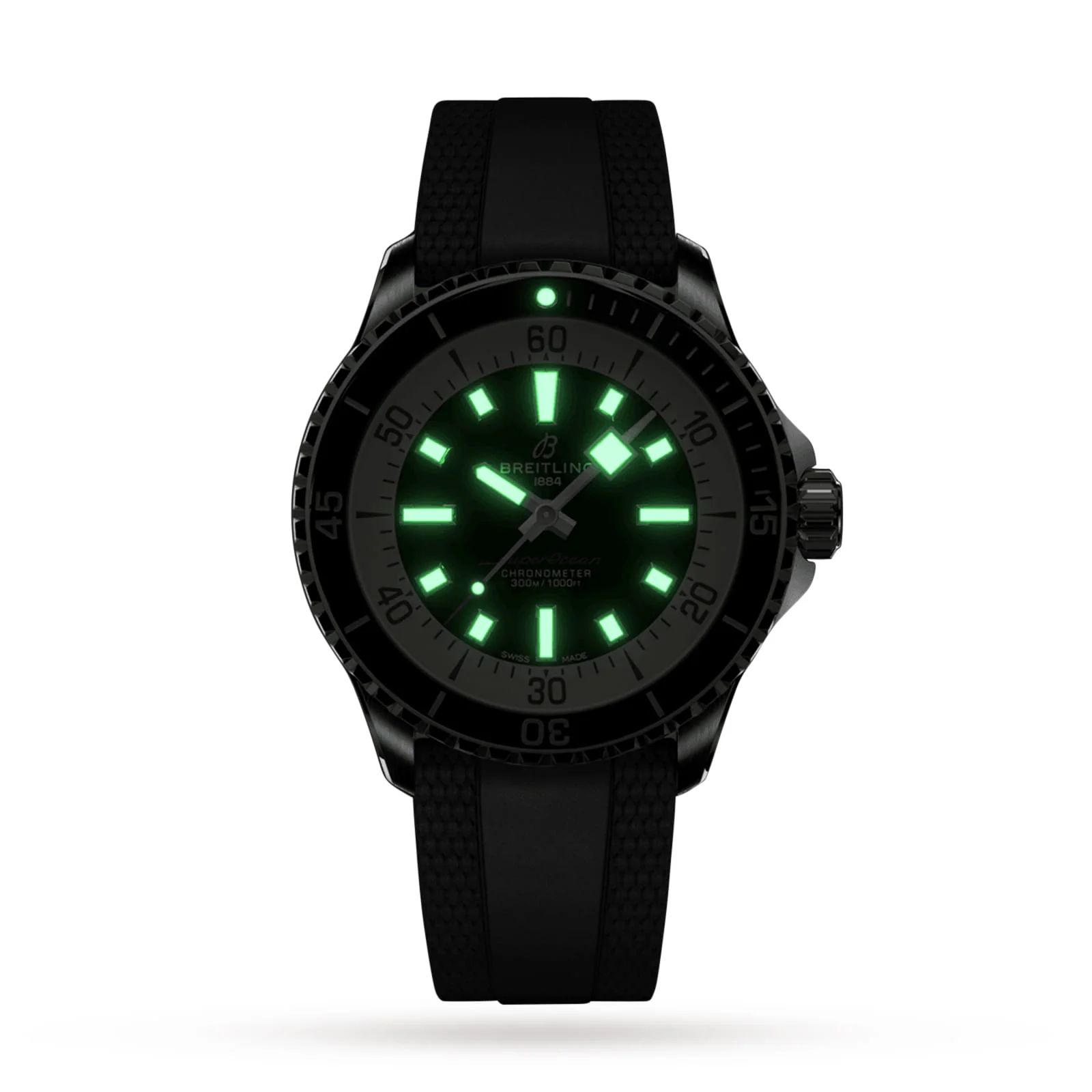 Inspired by the 1960s Slow Motion dive watch with contemporary updates The perfect timekeeper for all your water-based pursuits 42mm stainless steel case paired with a black rubber strap Powered by automatic Breitling 17 calibre movement with a 38-hour power reserve Shock, sand and saltwater resistant A CLASSIC DIVE WATCH The new Superocean Automatic 42 collection draws upon the design codes of the 1960s Slow Motion – a pared down timepiece designed to eliminate any feature that didn’t support the lifesaving needs of scuba divers. Modern features such as a ceramic inlayed bezel and brightly coloured dials, bring this practical timepiece up to date, while underwater performance is further enhanced by broad hands and indexes in Super-LumiNova for easy readability, and water resistance to 30 bar (300 metres). REFINED EXCELLENCE Pairing a 42mm stainless steel case with a black rubber strap, this Superocean model offers shock, sand, and saltwater resistance. For maximum safety underwater, a ceramic unidirectional bezel frames the black dial, with hands and indexes coated in luminescent Super-LumiNova for superior readability. Power and precision are provided by the Breitling 17 calibre movement.