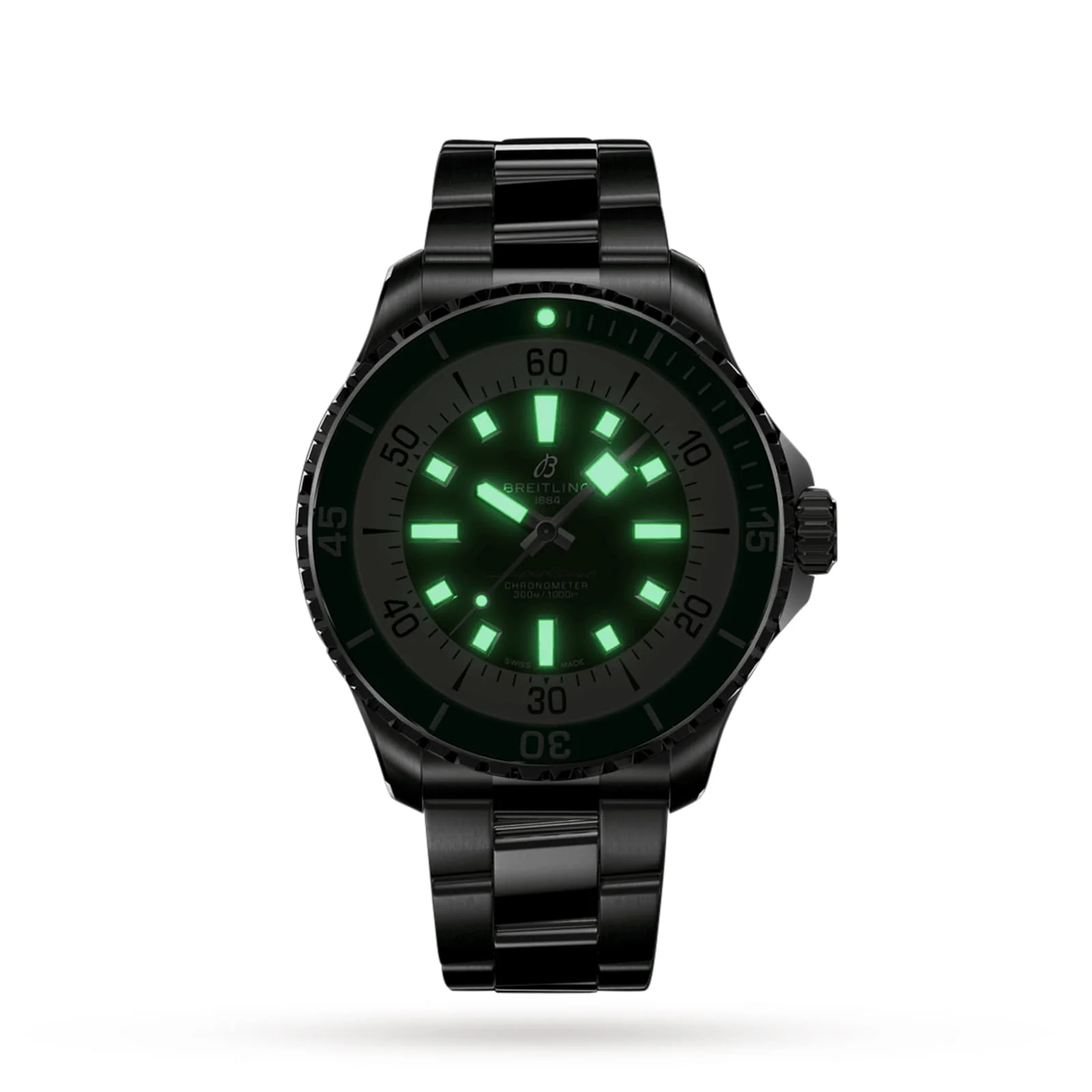 Inspired by the 1960s Slow Motion dive watch with contemporary updates The perfect timekeeper for all your water-based pursuits 44mm stainless steel case paired with a sophisticated stainless steel bracelet and a bold green dial Powered by automatic Breitling 17 calibre movement with a 38 hour power reserve Shock, sand and saltwater resistant A REIMAGINED VERSION OF A CLASSIC DIVE WATCH The Superocean Automatic 44 collection draws upon the design codes of the 1960s Slow Motion – a pared down timepiece designed to eliminate any feature that didn’t support the lifesaving needs of scuba divers. Modern features such as a ceramic inlayed bezel and brightly coloured dials, bring this practical timepiece up to date, while underwater performance is further enhanced by broad hands and indexes in Super-LumiNova for easy readability, and water resistance to 30 bar (300 metres). VIBRANT STYLING This impressive 44m Superocean model is presented in a robust stainless steel case with a co-ordinating bracelet, secured with a folding clasp that can be micro-adjusted for ease of wear over a wetsuit. For optimum safety, the deep green ceramic bezel is unidirectional to help accurately keep track of time underwater, while the vibrant green dial has been carefully designed for enhanced legibility. Powered by the Breitling 17 calibre movement, this exceptional timepiece is ready for any challenge - surfing, swimming, and diving, right through to dinner in the evening.