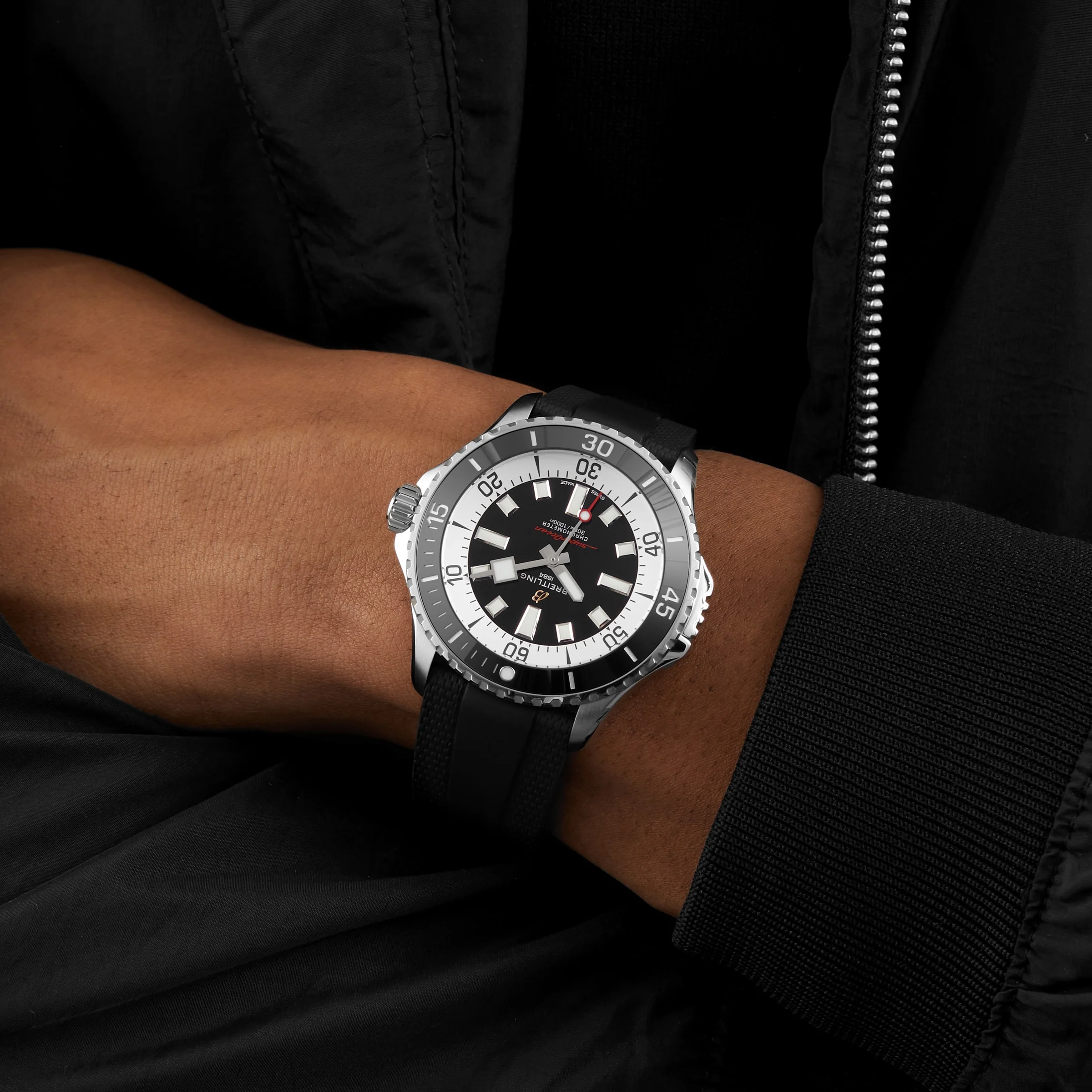 Enhances performance and style Water resistant up to 30 bar (300 metres) Presented in a 46mm stainless steel case and black rubber strap Powered by Breitling 17 calibre movement Luminescent hands for maximum legibility li> THE SUPEROCEAN COLLECTION Designed for those seeking serious underwater performance and contemporary style, the Superocean collection is always ready for action. The perfect companion for all water-based pursuits, the Superocean models offer water resistance up to 30 bar (300 metres) and luminescent hands and indexes for increased readability. DEEP SEA SWIMMING Presented on robust and waterproof black rubber strap is a 46mm stainless steel case which provides shock, sand, and water resistance to 30 bar (300 metres). This Superocean model combines iconic design with modern touches. The black toned unidirectional bezel frames the co-ordinating black dial decorated with chunky indexes and luminescent hands for maximum legibility at sea. In-house Breitling 17 calibre movement drives this timepiece and supplies ultimate power and precision.