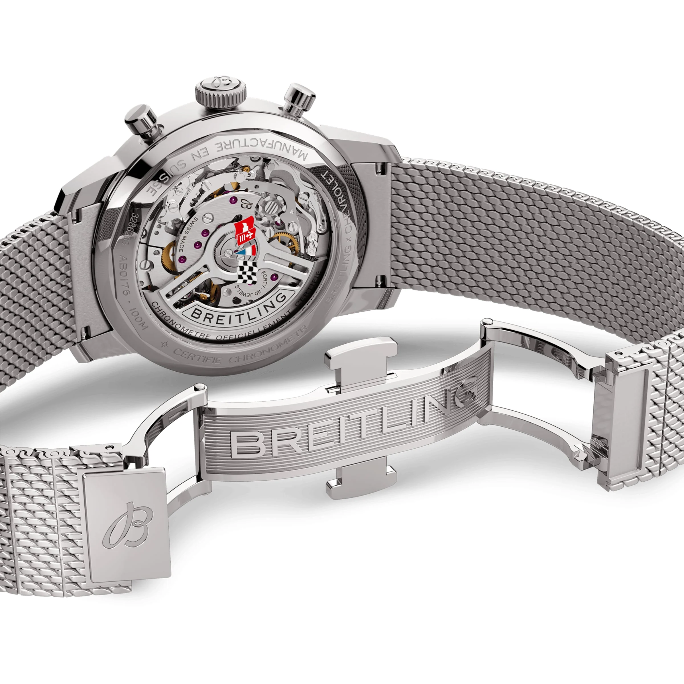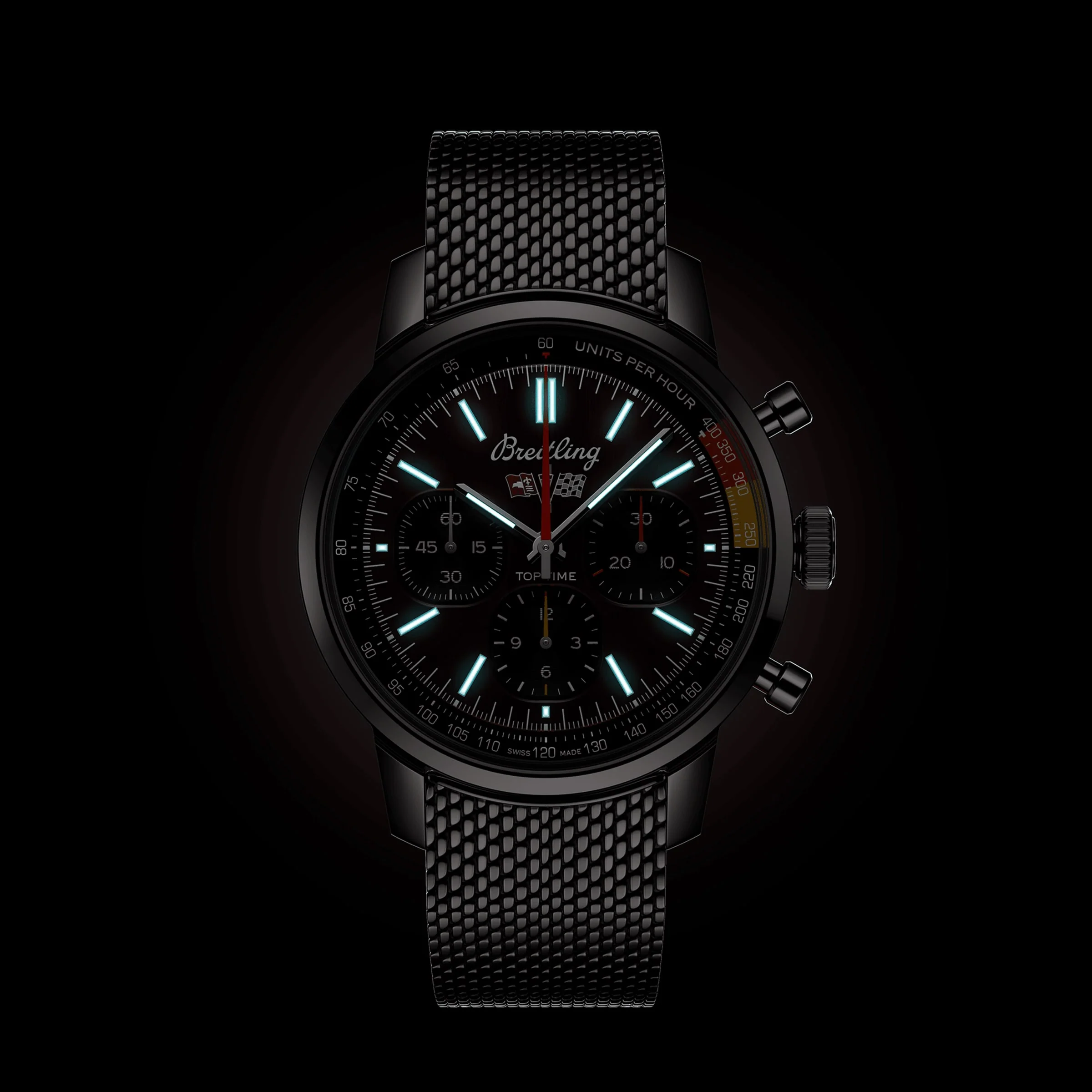 Top Time - a celebration of freedom and design Racing chronograph paying homage to classic sports cars from the 1960s Red dial with orange and yellow details, inspired by the colour palette of the Chevrolet Corvette Presented in a 41m stainless steel case with a steel mesh bracelet Driven by the Breitling Manufacture Calibre 01 A RACING CHRONOGRAPH A distinctive celebration of freedom and design, the Top Time collection pays homage to iconic sports cars from the 1960s. Manufactured between 1963 and 1967, the second- generation Chevrolet Corvette, known as the Sting Ray, has captured the imaginations of car lovers around the world for over 60 years, offering the perfect combination of a low-body profile and a powerful engine. Inspired by the most sought-after version of the American legend, this updated Chevrolet Corvette Top Time model features the colours and emblem of its classic-car counterpart, a speed-measuring tachymeter scale, and contrasting 'squircle' sub-dials to offer a nod to vintage dashboard gauges. A TRIBUTE TO THE CHEVROLET CORVETTE This fast-paced model is characterised by its striking red dial with notable yellow and orange racing- inspired features, alongside three black sub-dials, and the Top Time Chevrolet Corvette logo. Designed to perform in all conditions, on and off the track, the 41mm stainless steel case is presented on a mesh steel bracelet. Under the hood, the Breitling Manufacture Calibre 01 movement ensures precision and reliability.