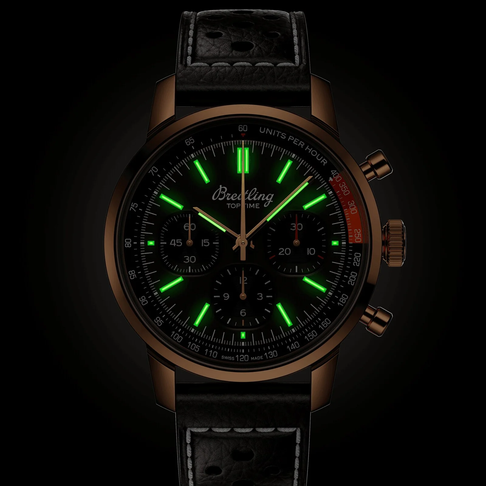 In the 1960s, the world was alive with vibrancy, joy, and a sense of rebellion. It was a decade of explorat ion, adventure, and living life to the fullest. Willy Breitling embodied this spirit and created the Top Time, a unique and unconven tional chronograph that captured the essence of the era. Today, that same passion and energy can be found in the Top Time B01, compl ete with a perforated leather racing strap, tachymeter scale, and distinctive "squircle" subdials reminiscent of vintage dashboard g auges. And let's not forget the powerful engine that drives it all - the exceptional Breitling Manufacture Caliber 01. Experience th e ultimate in speed and style with the Top Time B01.
