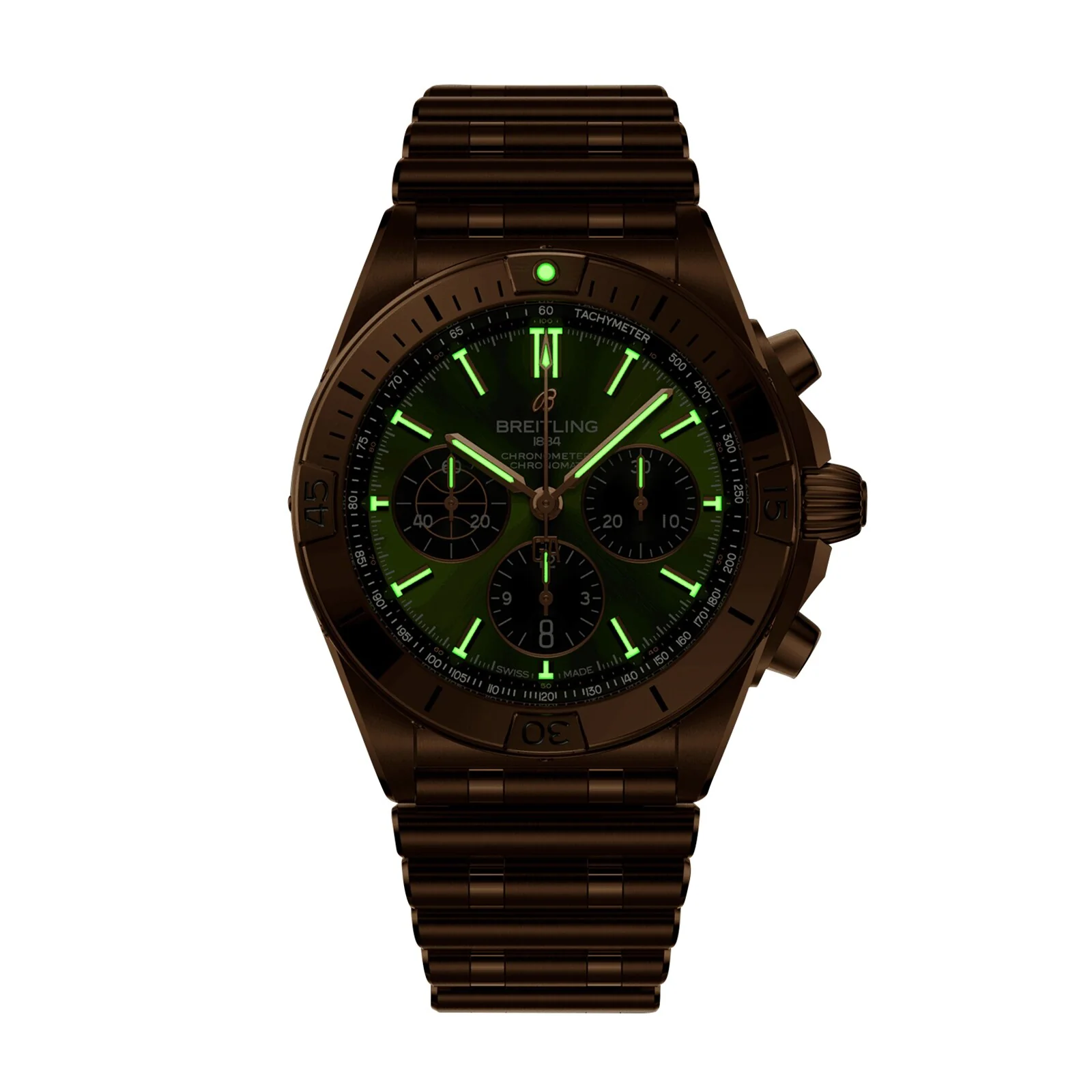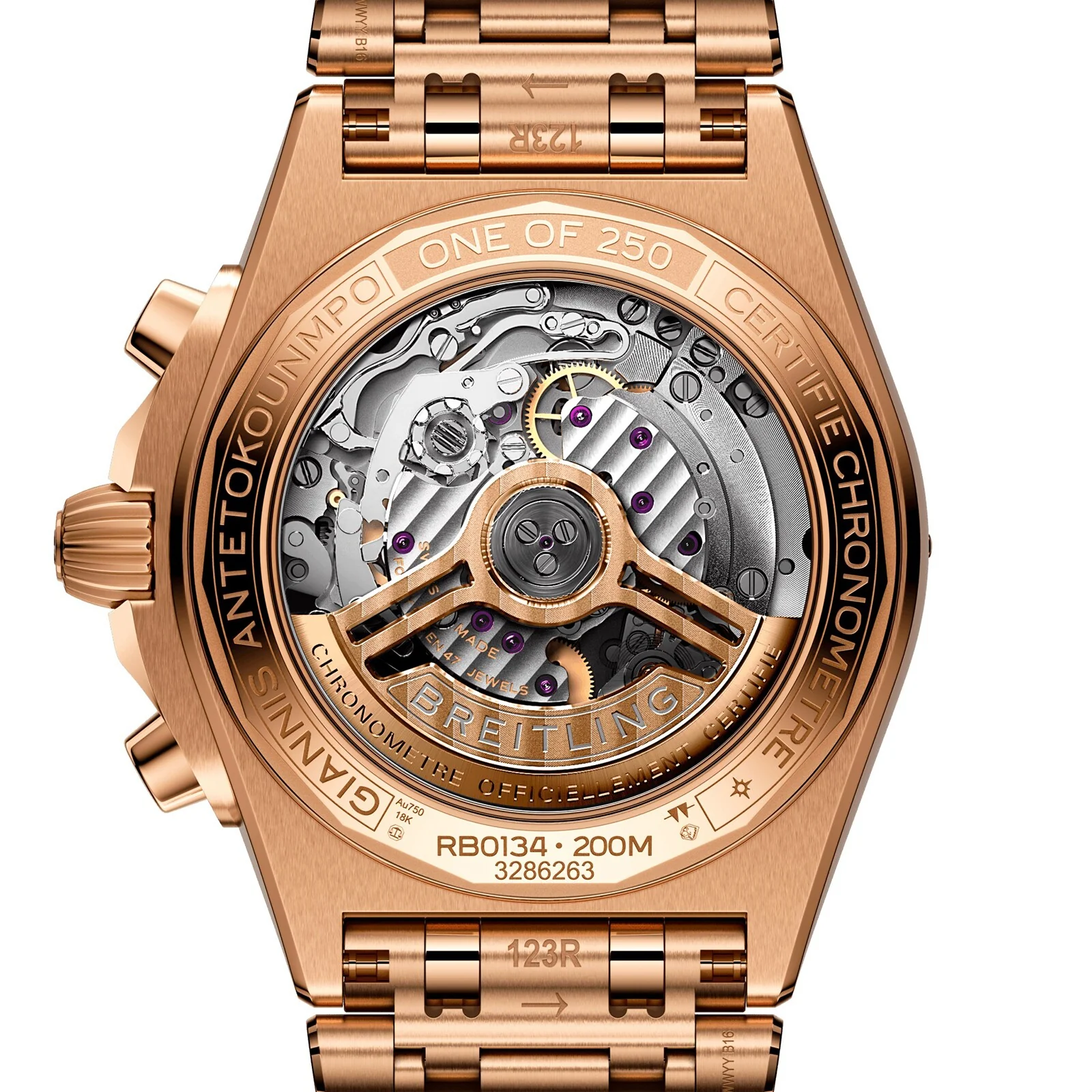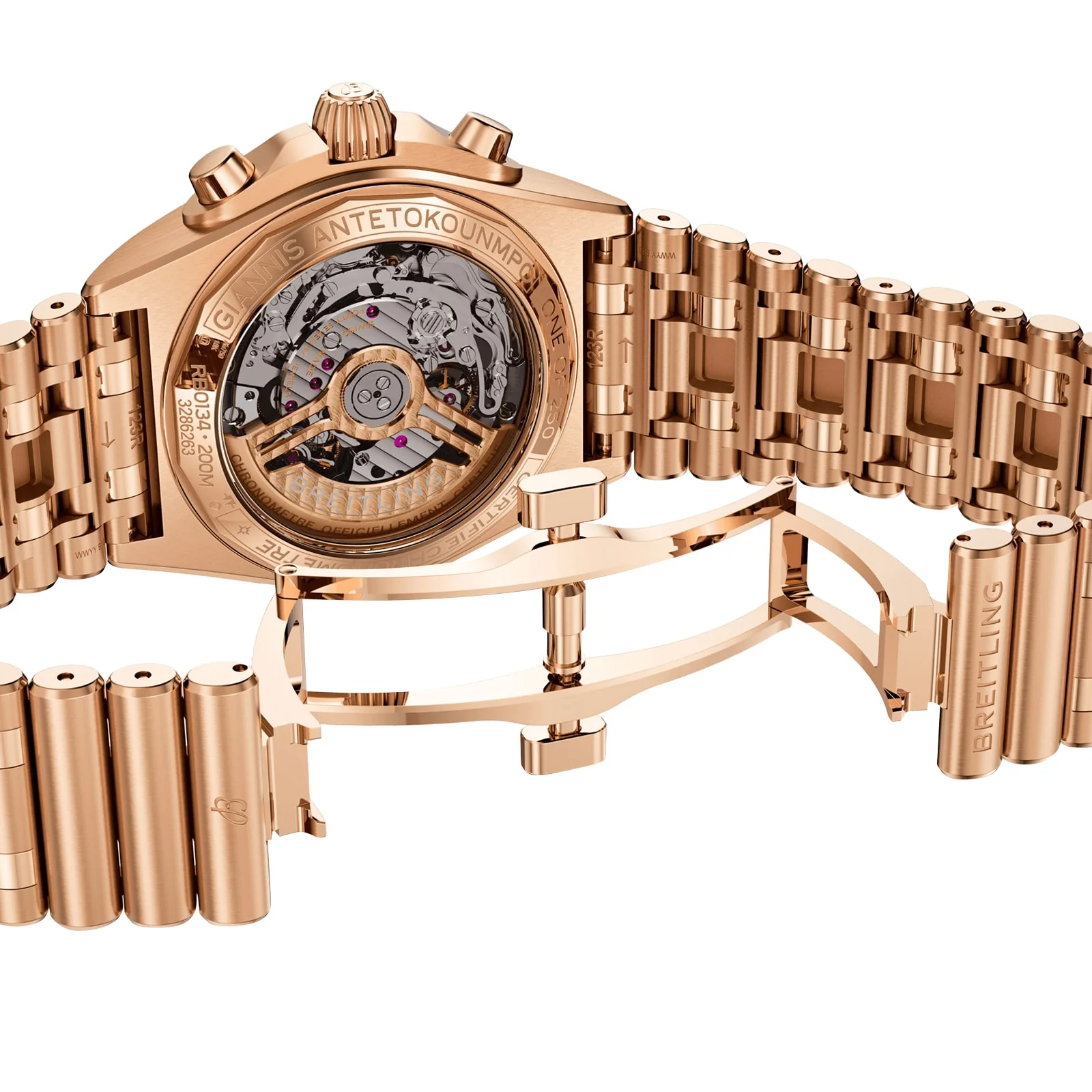 Breitling’s versatile Chronomat in a limited-edition collaboration with Giannis Antetokounmpo. Limited to only 2,000 pieces, the Giannis Antetokounmpo Chronomat collection combines our timeless craftsmanship with the Pro Basketball Player’s easygoing style. It features green colorways chosen by Giannis himself while preserving classic Chronomat design elements such as the “Rouleaux” bracelet—in metal or rubber—and raised rider tabs at the 15-minute marks. Note the central hand’s counterweight bearing the athlete’s initials “GA” and the basketball outline on the running seconds counter of the Chronograph—a nod to his profession and passion. The limitation, “One of 1750” for the 40 mm stainless-steel Automatic GMT or “One of 250” for the 42 mm 18 k red gold Chronograph is engraved on the caseback. Each watch comes in a special box with a note from Giannis. A watch enthusiast, Giannis has also designed his own one-of-a-kind Chronomat featuring a green inverted-panda dial and Eastern Arabic numerals—though you might only catch a glimpse of this unique piece courtside. The Chronomat Giannis Antetokounmpo collection is meant for those who can relate to the basketball MVP’s power, precision, and performance—traits that have everything in common our timepieces.