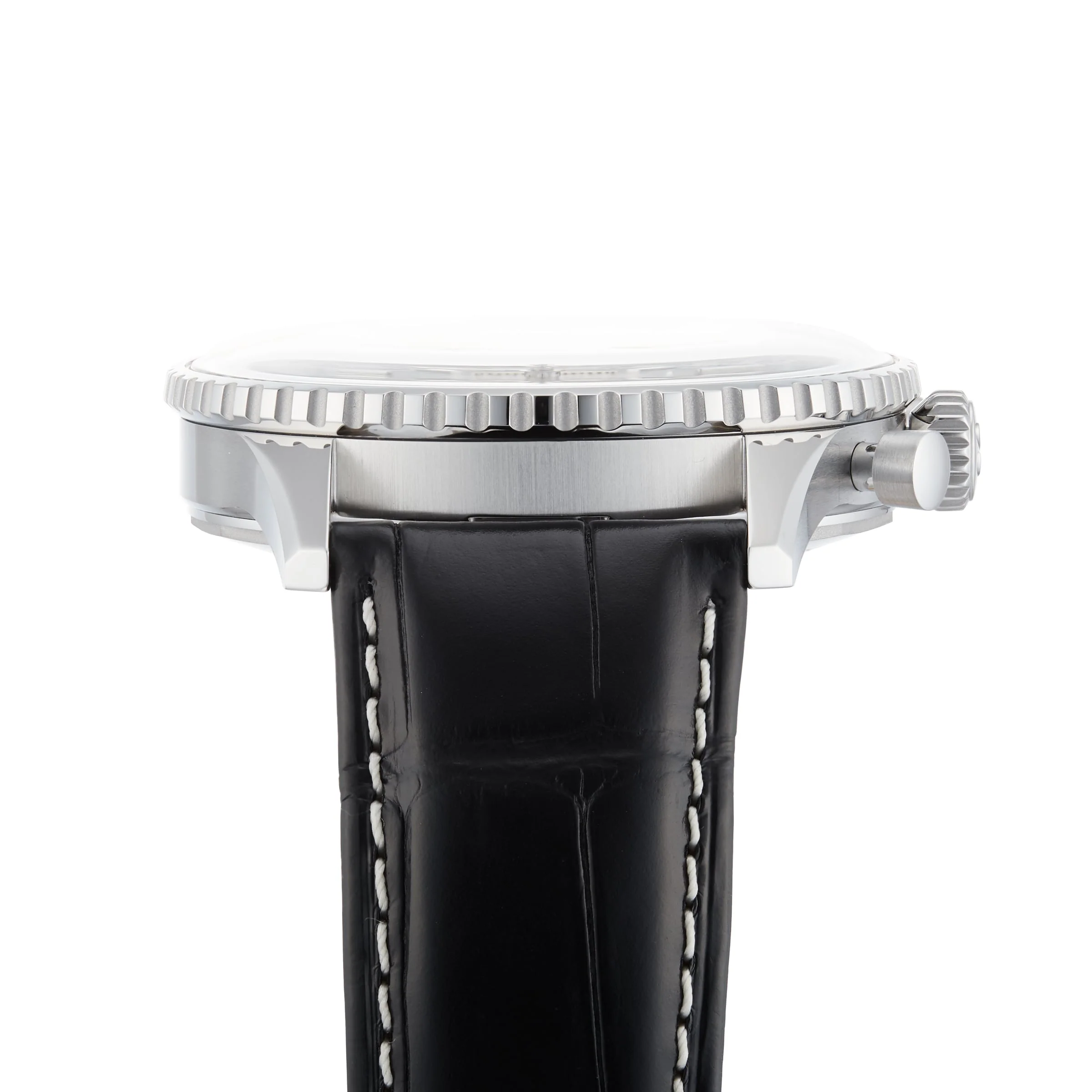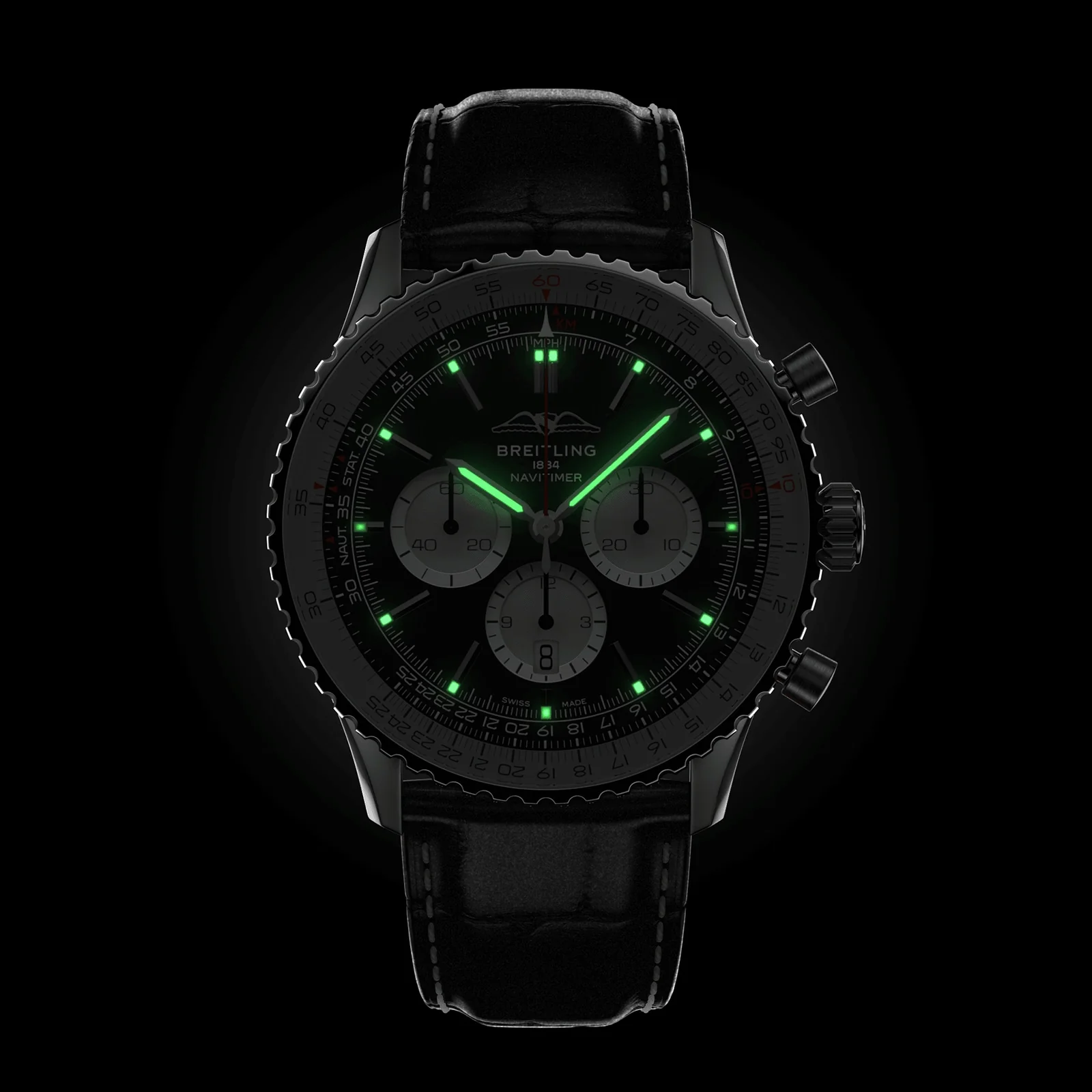 Navitimer – a staple of sophistication and elegance A re-imagined design, retaining the timepiece’s iconic elements 46mm case with a black dial and trio of chronograph counters B01 Chronograph movement with 70 hrs power reserve Water resistant up to 3 bars (30 metres) AVIATION HERATIGE A modern take on Breitling’s original beloved pilot’s watch, the Navitimer B01 Chronograph is a vision of classic excellence. Honouring the legend of a timepiece that not only adorned the wrists of pilots for over 70 years, but also accompanied astronauts into space and joined the biggest stars on earth on the red carpet. Preserving the classic features of the model with refined modern enhancements, this timepiece is a model of understated quality and precision timekeeping. A compact profile, alternating polished and brushed finishes and unmistakable watch face featuring three chronograph counters create an elegant addition to the Navitimer family. ICONIC DETAILS This Navitimer timepiece features a 46mm stainless steel case with a notched bezel for easy grip. The black dial is enhanced with stainless steel baton indexes, 3 contrasting white sub-dials, and a discreet date window situated at the 6 o’clock position. The iconic AOPA wings return to their original 12 o’clock position for a hint of nostalgia, with an open-caseback allowing an uninterrupted view of the COSC-certified Breitling 01 calibre movement. This exceptional timepiece features a black alligator strap with contrasting white stitching, and a sapphire crystal domed case for optimal comfort and clarity.
