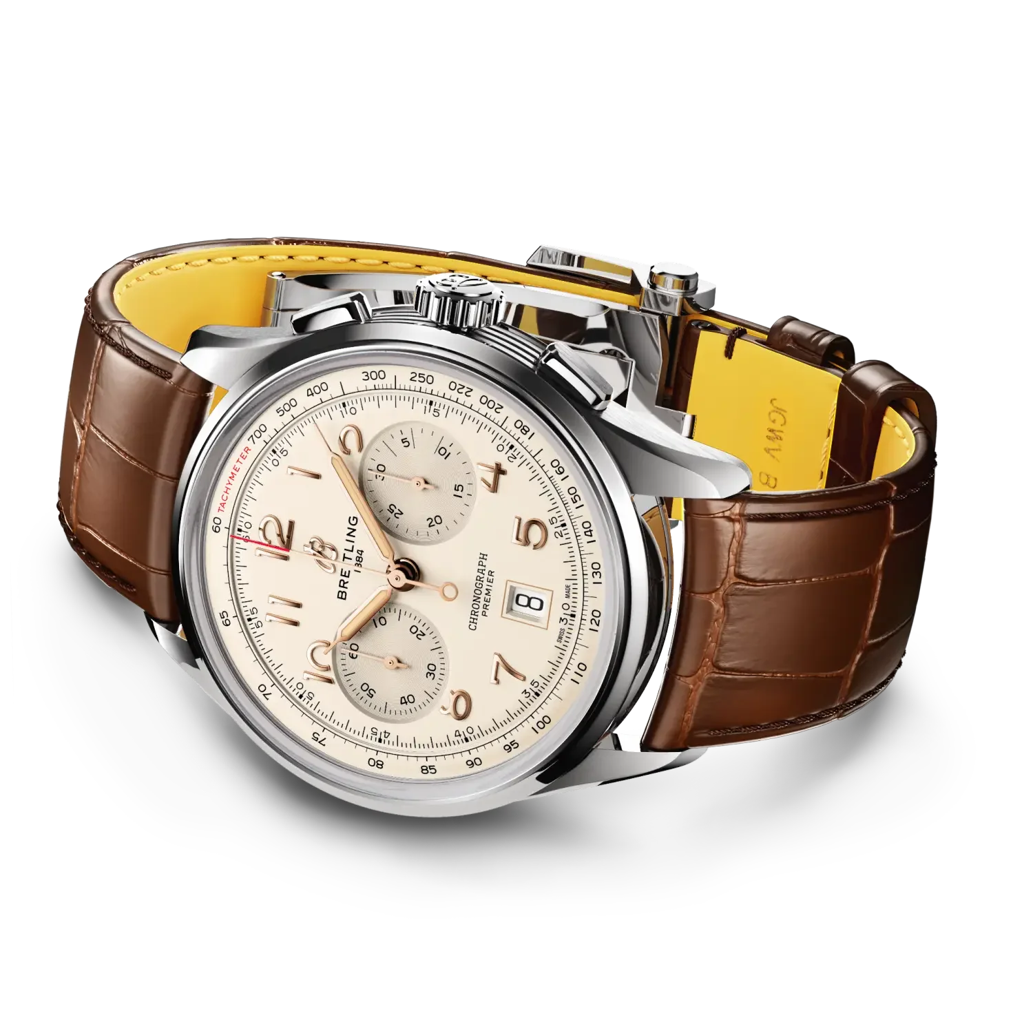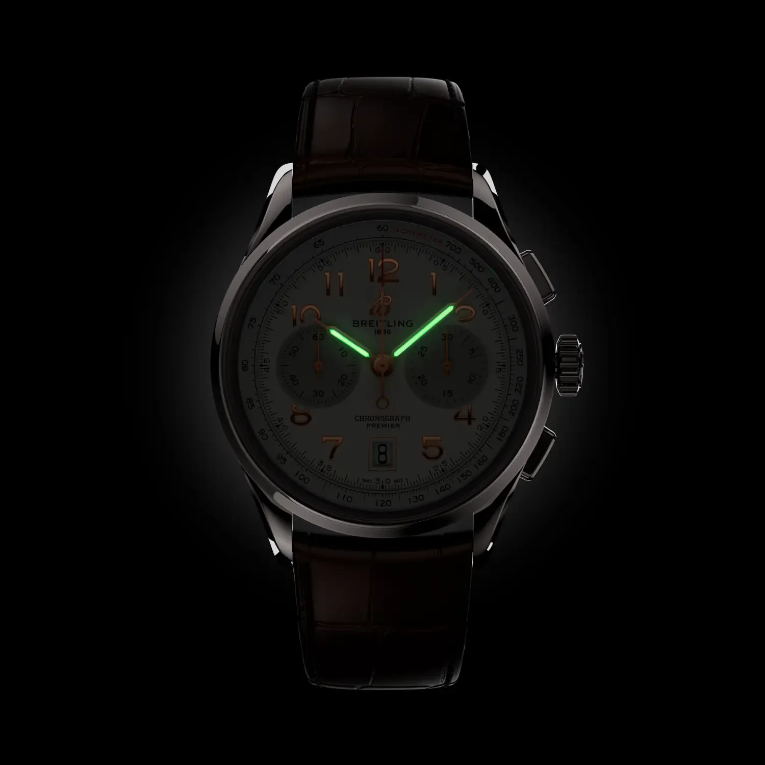 In the 1940s, Willy Breitling already envisioned a future after the war filled with hope and opportunity. His vision led him to design the Premier, a functional yet elegant chronograph that exudes impeccable taste. The modern Premier, with its vintage-inspired details such as the smooth fixed bezel, twin-register dial, and applied Arabic numerals, is available in a variety of colors and materials. Whether worn with a classic alligator leather strap or a sleek metal bracelet, the Premier B01 Chronograph 42 boasts the uncompromising technical standards of Willy Breitling. Its self-winding movement, the COSC-certified Breitling Manufacture Caliber 01, guarantees precision, reliability, and functionality. Experience the passion and excellence of the Premi er today.