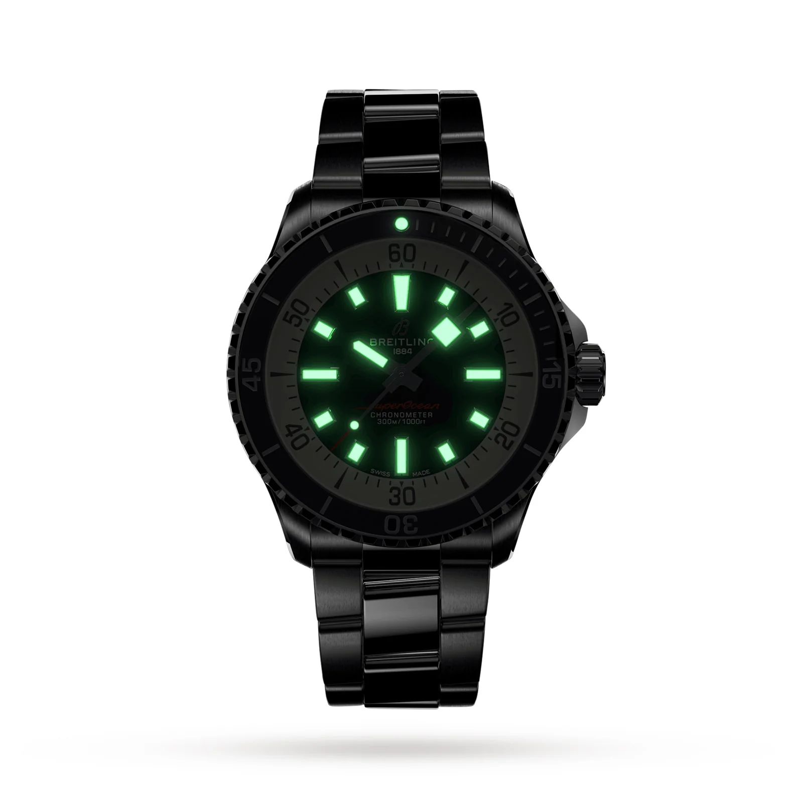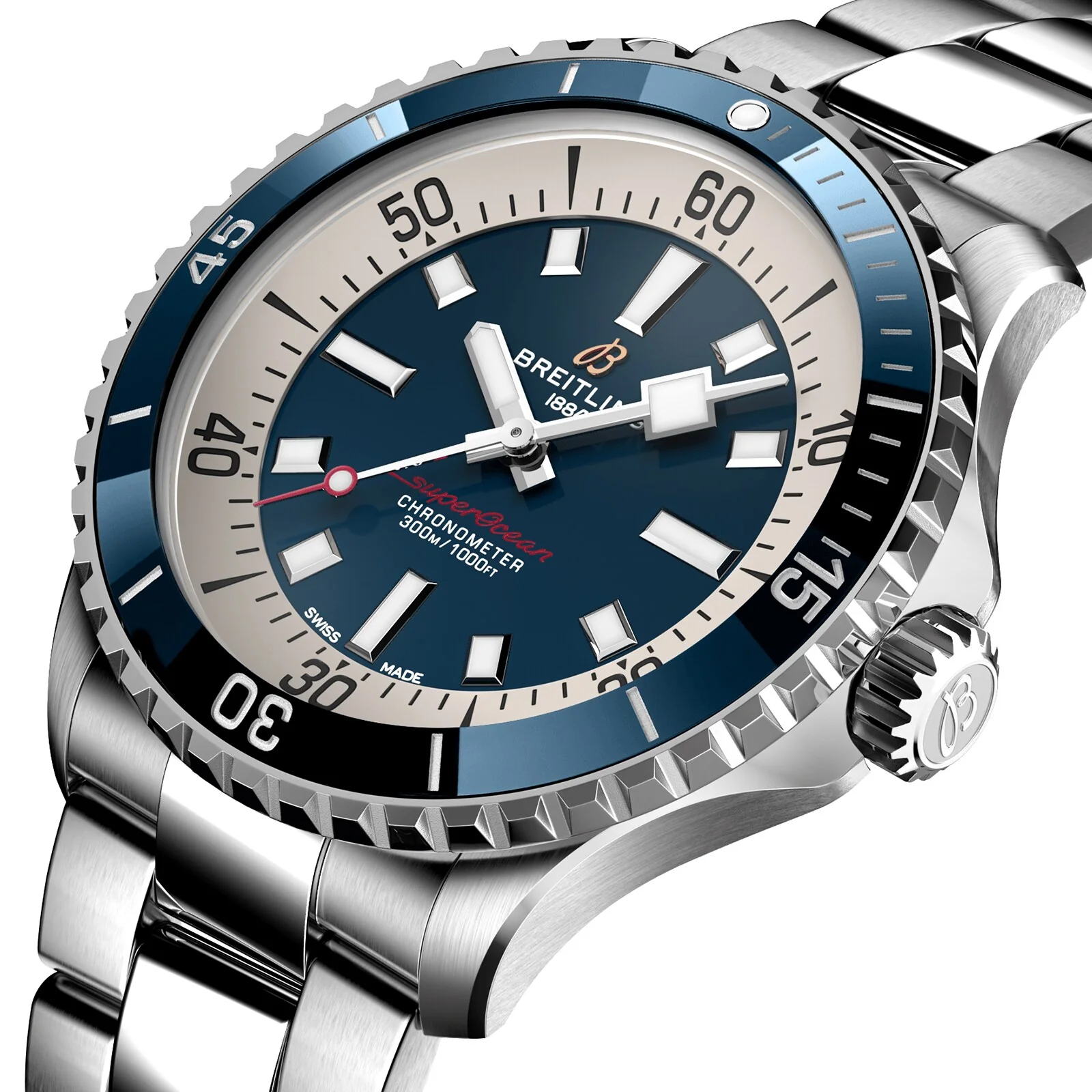 Inspired by the 1960s Slow Motion dive watch with contemporary updates The perfect timekeeper for all your water-based pursuits 42mm stainless steel case paired with a sophisticated stainless steel bracelet Powered by automatic Breitling 17 calibre movement with a 38 hour power reserve Shock, sand and saltwater resistant A CLASSIC DIVE WATCH The Superocean Automatic 42 collection draws upon the design codes of the 1960s Slow Motion – a pared down timepiece designed to eliminate any feature that didn’t support the lifesaving needs of scuba divers. Modern features such as a ceramic inlayed bezel and brightly coloured dials, bring this practical timepiece up to date, while underwater performance is further enhanced by broad hands and indexes in Super-LumiNova for easy readability, and water resistance to 30 bar (300 metres). UNDERWATER EXCELLENCE This 42m Superocean model is presented in a robust stainless steel case with a co-ordinating bracelet, secured with a folding clasp that can be micro-adjusted for ease of wear over a wetsuit. For optimum safety, the ceramic bezel is unidirectional to help accurately keep track of time underwater, while the blue dial has been carefully designed for enhanced legibility. Powered by the Breitling 17 calibre movement, this exceptional timepiece is ready for any challenge - surfing, swimming, and diving, right through to dinner in the evening.