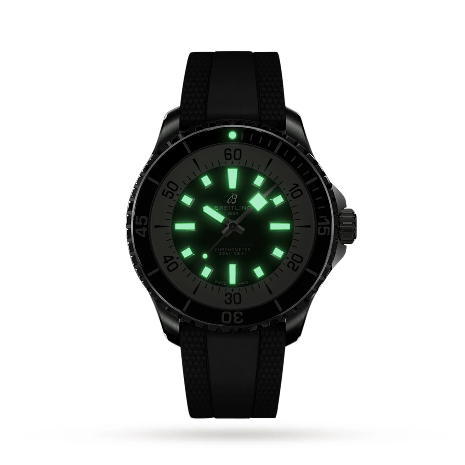 Ready for any water-based challenge – swimming, diving, or surfing Combines serious performance with classic style 44mm stainless steel case paired with a black rubber strap Powered by automatic Breitling 17 calibre movement with a 38-hour power reserve Water resistant to 100 bar (1000 metres) FOR ADVENTURES CLOSER TO THE SHORE The perfect timekeeper for water-based pursuits, the Superocean collection is renowned for its outstanding performance on land and beneath the waves. Finding the perfect balance between serious performance and classic style, the Superocean Automatic 44 is robust, water resistant to 100 bar (1000 metres), and up to any challenge – deep beneath the waves or closer to the shore. YOIR DEEP SEA SAVIOUR This 44m stainless steel Superocean model is presented on a black rubber strap and provides shock, sand, and saltwater resistance. The black dial is framed by a ceramic unidirectional bezel for ultimate safety during deep sea adventures. For power and precision, this timepiece relies on the Breitling 17 calibre movement.