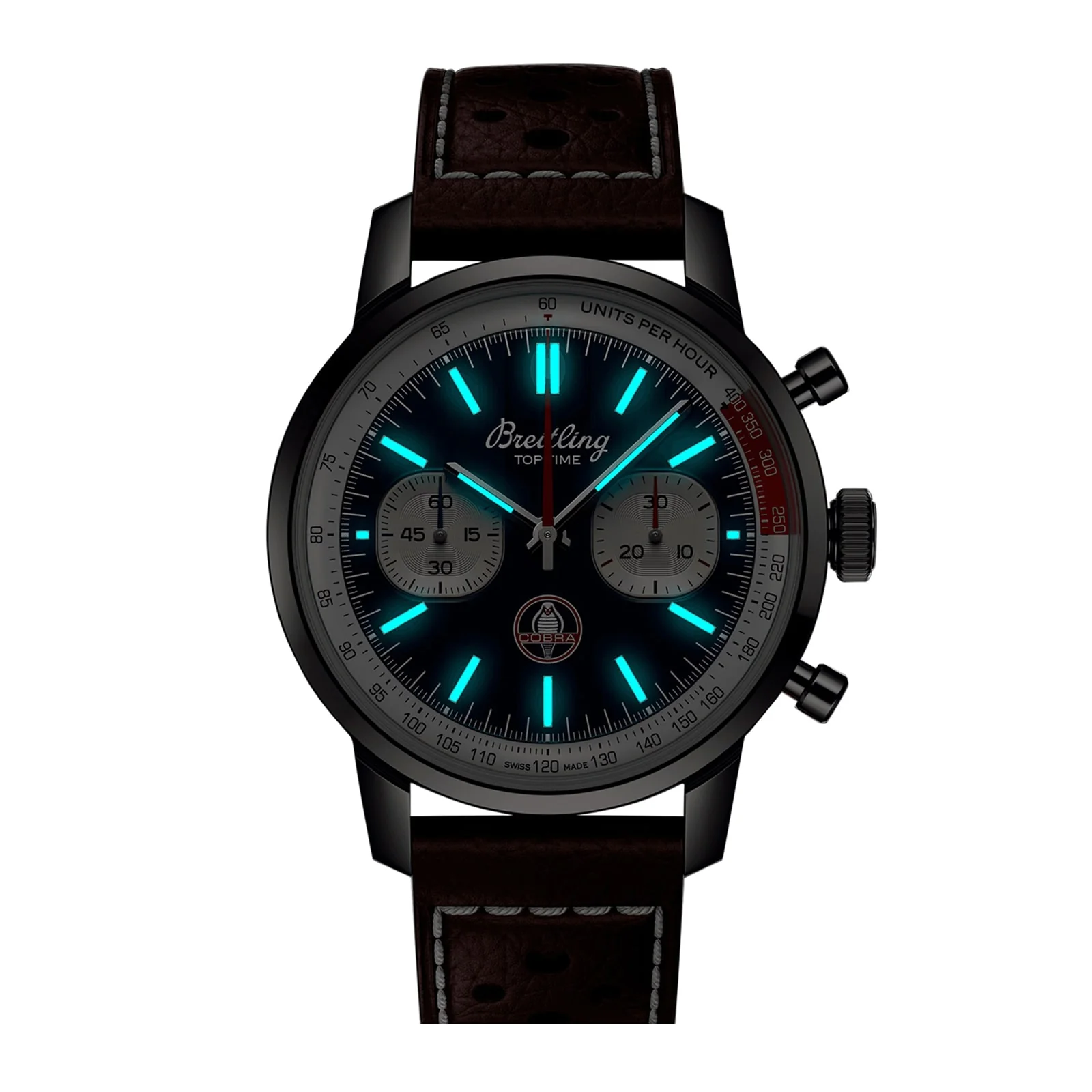 Top Time – an unconventional collection for an unconventional decade Inspired by the Shelby Cobra introduced in 1962 Presented in a robust 41mm stainless steel case Classic blue dial featuring the colours and emblem of the Cobra from which it draws its inspiration Driven by the Breitling Manufacture Calibre 01 movement for flawless precision LIVE LIFE AT FULL SPEED Launched in the 1960s, a decade of fun and freedom, the Top Time collection was designed around unconventional chronographs that captured the distinct spirit of the era. Today, the brand partners with some of the coolest names in the automotive world to create its Top Time designs. This Shelby Cobra edition pays tribute to the 1960s vehicle introduced by Les Mans winner Carrol Shelby. Bringing together a small, light British style chassis and a strong, reliable American big-block engine, the Cobra enjoyed instant success, on the race track and amongst sportscar fans. INSPIRED BY THE CLASSIC SHELBY COBRA Presented in a robust 41mm stainless steel case, this smart and sporty timepiece makes an instant impact. The vibrant blue dial features the colours and emblem of the Cobra from which it draws its inspiration, while the speed measuring tachymeter scale and squared sub-dials offer a nod to the dashboard of the retro vehicle. Under the hood, the Breitling Manufacture Calibre 01 movement ensures flawless precision and offers a 70-hour power reserve. A perforated brown leather racing strap with contrasting stitching completes the look.