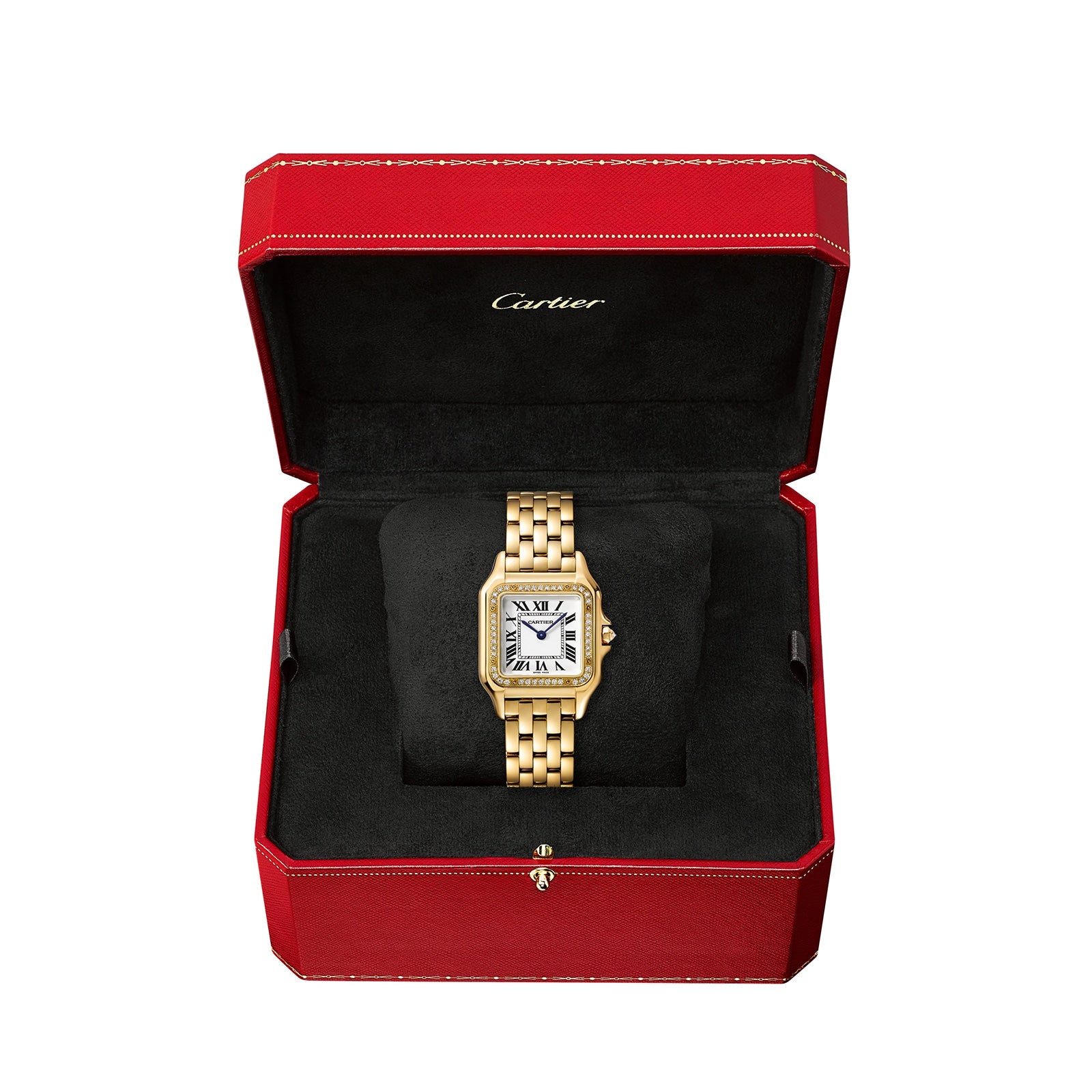 Panthère de Cartier - a quintessential jewellery watch Embracing clean lines with a creative, linear softness Beautifully presented in a 27mm x 36mm case crafted from 18K yellow gold Silvered dial framed by radiant brilliant cut diamonds Complete with a graceful 18K yellow gold bracelet channelling the agility of the panther A STYLE ICON Supple and elegant, the Panthère de Cartier is timeless and iconic. First created in the 1980s, the collection is characterised by the ultra-flexible bracelet, echoing the graceful movements of the panther - the Maison's emblematic animal. A quintessential jewellery watch, the Panthère aspires for clean lines, without losing a sense of creative, linear softness. BOLD AND GRACEFUL This iconic timepiece has become synonymous with Cartier's bold yet graceful energy. Crafted from 18K yellow gold and accented with a blue sapphire-set crown, the 27mm x 36mm case features softly round edges that enhance its graceful form. The silvered dial plays host to blued-steel sword-shaped hands and Roman numerals, framed by a radiant diamond-set bezel. Inspired by the movement of the panther, the flexible steel bracelet completes the harmonious blend of luxury and practicality, ensuring comfort on the wrist. Powerful and precise timekeeping are delivered by the Quartz movement, while water resistance to 3 bar (30 metres) enhances functionality.