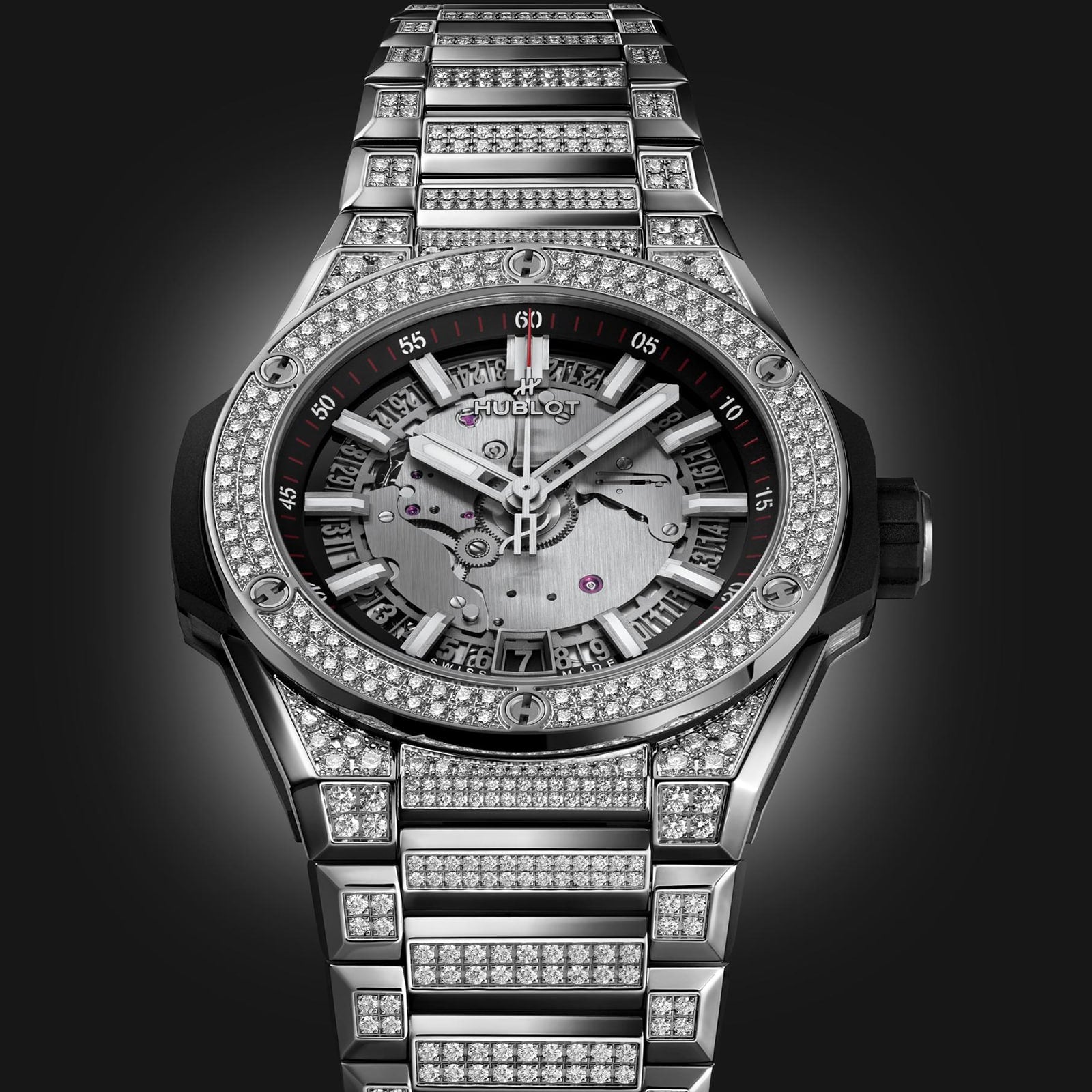 Big Bang Integrated Time - a modern art Presented in a 40mm polished titanium case set with 128 glistening diamonds The bezel set with 126 diamonds introduces further sparkle and light Secured by an integrated titanium bracelet set with a further 808 diamonds Powered by the HUB1710 self- winding movement visible through the sapphire crystal skeleton dial RETURNING TO THE TRUE ESSENCE OF WATCHMAKING Hublot’s flagship model, the Big Bang collection has undoubtably revolutionised the watchmaking universe – bringing together extraordinary design elements that never fail to make an impact. An unapologetic contemporary icon, this Time Only model refocuses its attention on the true essence of watchmaking – hours, minutes, seconds, and the date, while the new 40mm case is thinner than ever. DAZZLING DIAMONDS Designed with extreme attention to detail, this Big Bang Integrated Time model showcases a sapphire crystal skeleton dial presented in a 40mm titanium case, adorned with 128 beautiful diamonds. Reflecting light from every angle, additional sparkle is introduced by the polished titanium bezel set with 126 diamonds. Set with an incredible 808 diamonds, the iconic integrated titanium bracelet provides this timepiece with unrivalled strength and excellence. Refusing to compromise on performance, this impressive model is powered by the HUB1710 self-winding movement, offers a 50-hour power reserve, and is water resistant to 10 bar (100 metres).