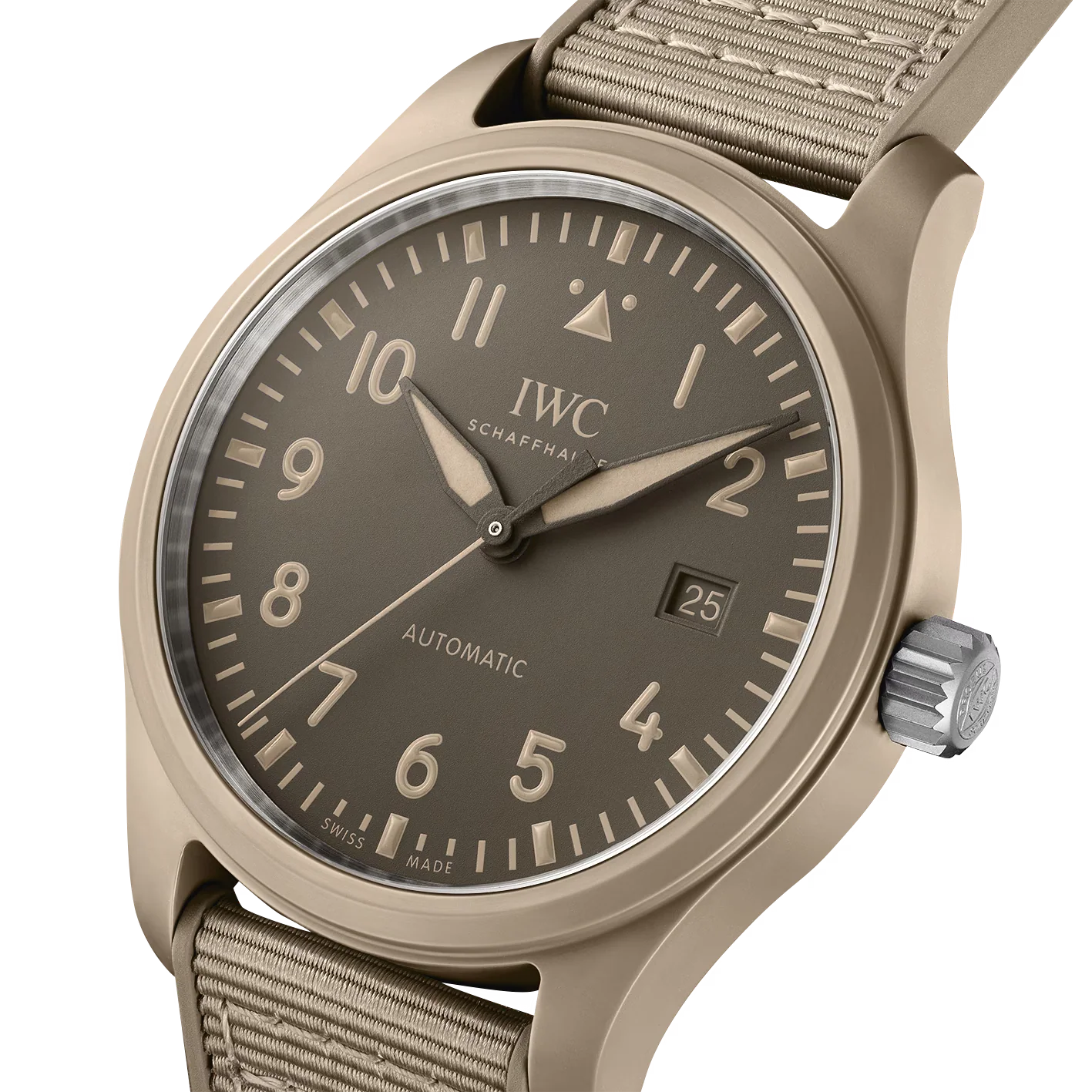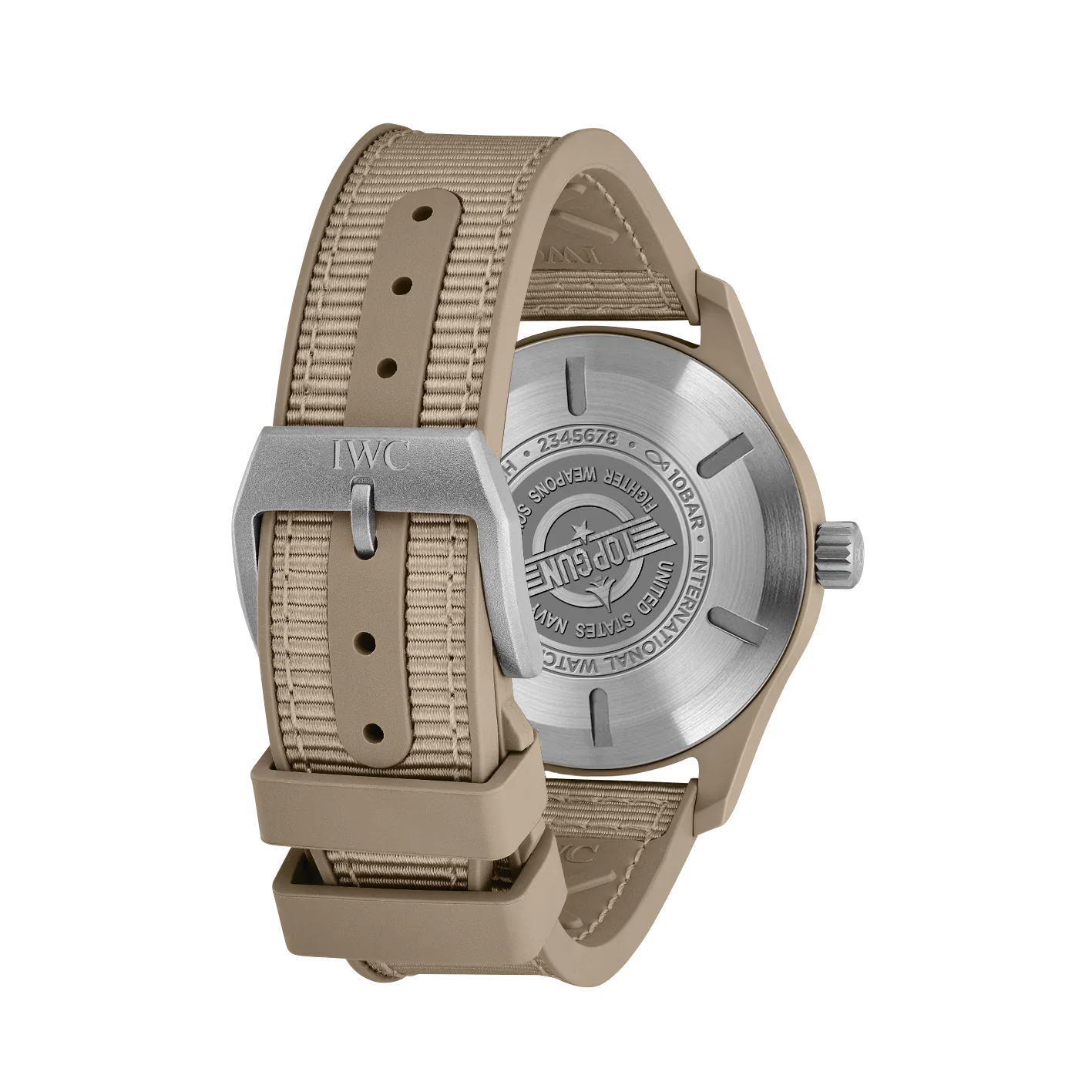 The Pilot’s Watch Automatic 41 TOP GUN Mojave Desert features a meticulously crafted 41-millimeter case made from sand-colored ceramic. The ceramic color “Mojave Desert” is inspired by Navy pilots’ flight suits and the desert landscape around the Naval Air Weapons Station China Lake, home to some of the Navy’s most skilled pilots. Engineering ceramics undergo a complex and highly sophisticated manufacturing process. It begins with powdered raw materials, which are shaped into a pre-form known as “green body” and then machined closer to the final geometry. The next step involves sintering the case at high temperatures in a kiln. During this heat process, ceramic obtains its unique properties like its extreme hardness and scratch-resistance. The distinctive earthy khaki hue is achieved by blending zirconium oxide with other metallic oxides in a precisely defined mixing ratio. The subdued brown dial features a minute scale and numerals in a muted tone, all coated with Super-LumiNova® to ensure perfect legibility in low light conditions. The Pilot’s Watch Automatic 41 TOP GUN Mojave Desert is powered by the IWC-manufactured 32112 calibre, a robust and precise automatic movement with a power reserve of 120 hours. It is fitted with a beige rubber strap with a textile inlay and a titanium pin buckle. The case back is crafted from titanium and features an engraving of the iconic “TOP GUN” logo.