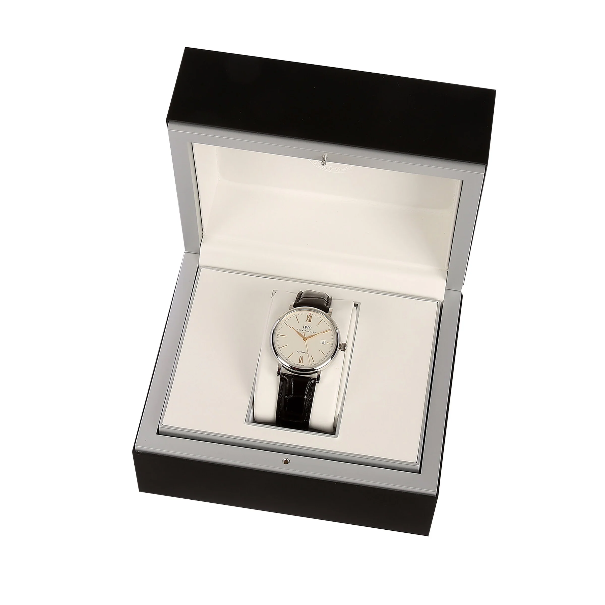 Reimagining an iconic design Powered by Swiss-made automatic movement and water resistant to 3 bar (30 metres) Presented in a striking 40mm stainless steel case and secured with a black alligator leather strap with a pin buckle for added security on the wrist Water resistant to 3 bar (30m) Featuring a 42-hour power reserve SPORTING INSPIRATION Celebrating the IWC Schaffhausen vision of pairing impeccable Swiss precision with cutting edge technology, the Portofino collection takes its design cues from the 1960s, with elegantly sporty push-buttons and chronograph displays. For over 30 years, the collection has effortlessly encapsulated the laid-back Mediterranean lifestyle with understated luxury. With a distinctly sport-inspired aesthetic, this 42mm timepiece is timelessly elegant, powerful and precise. A BEACON OF LUXURIOUS STYLE The robust 40mm stainless steel case is paired with a stylish black alligator leather strap with a pin buckle for added security on the wrist. The crisp white dial is home to gold-tone hour markers and hands, a date display window positioned at 3 o’clock display, as well as Roman numeral markers at 12 and 6 o’clock. Protected by a sapphire crystal lens with anti-reflective coating to eliminate glare and powered by a Swiss-made automatic movement, this timepiece is equipped with a 42-hour power reserve and is water resistant up to 3 bar (30 metres).