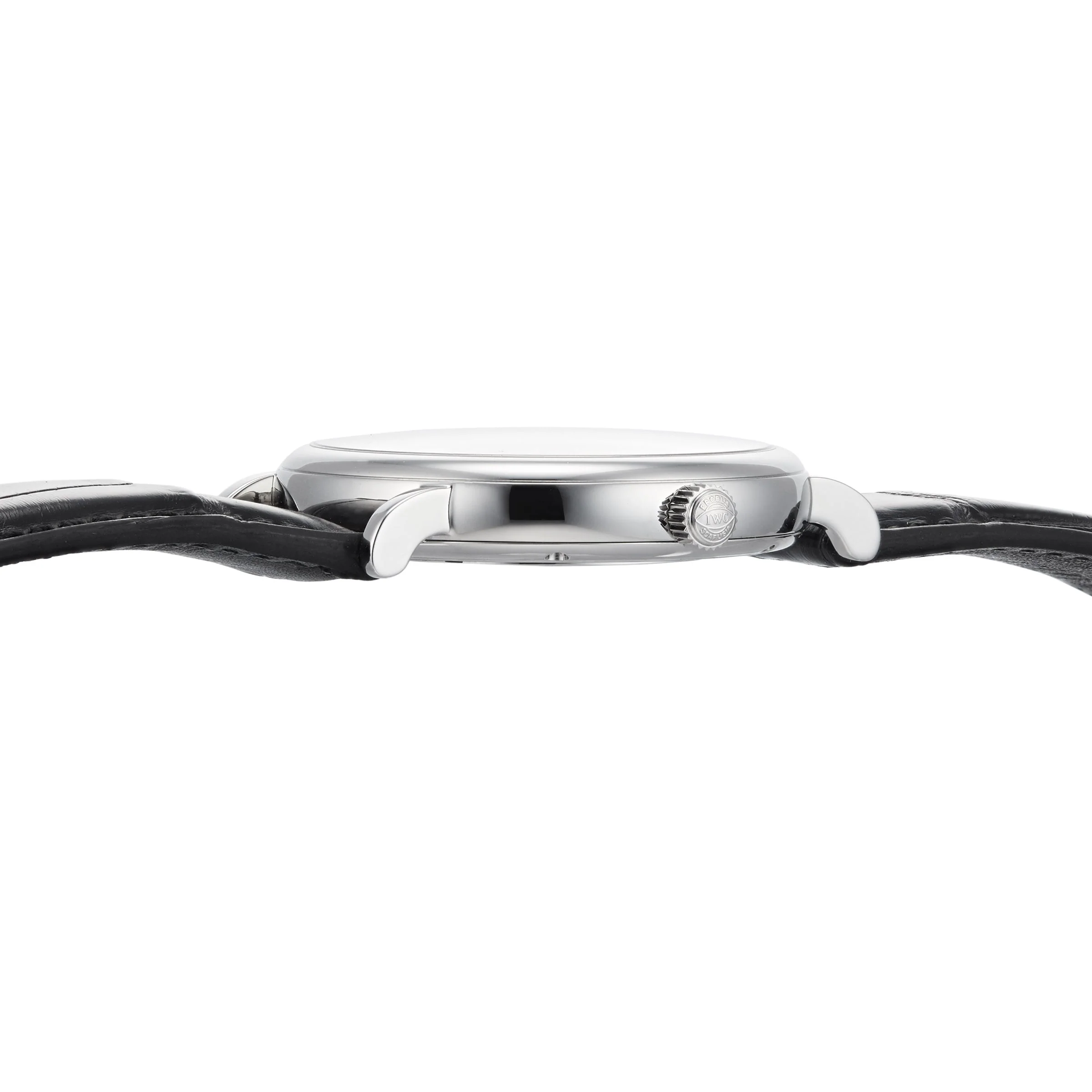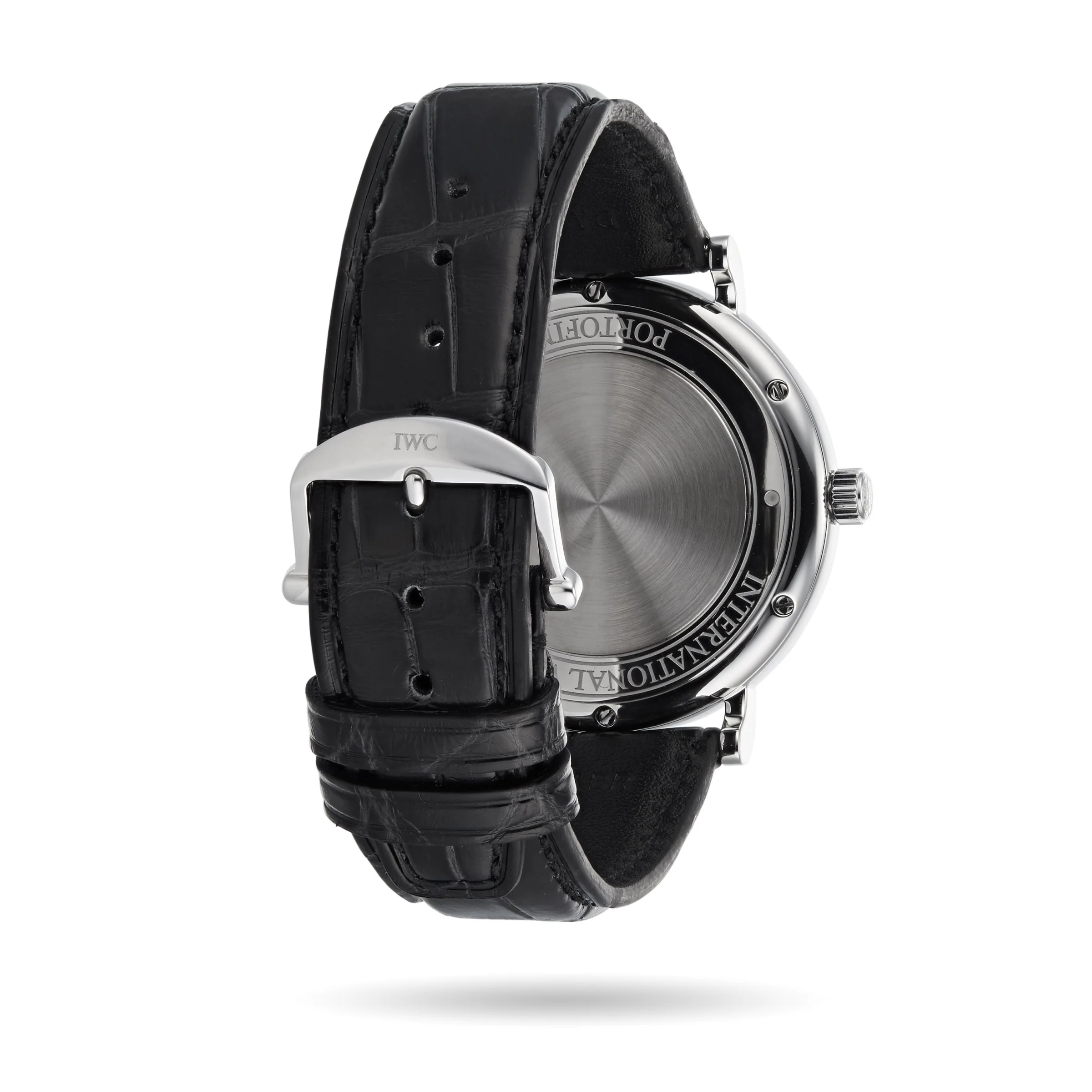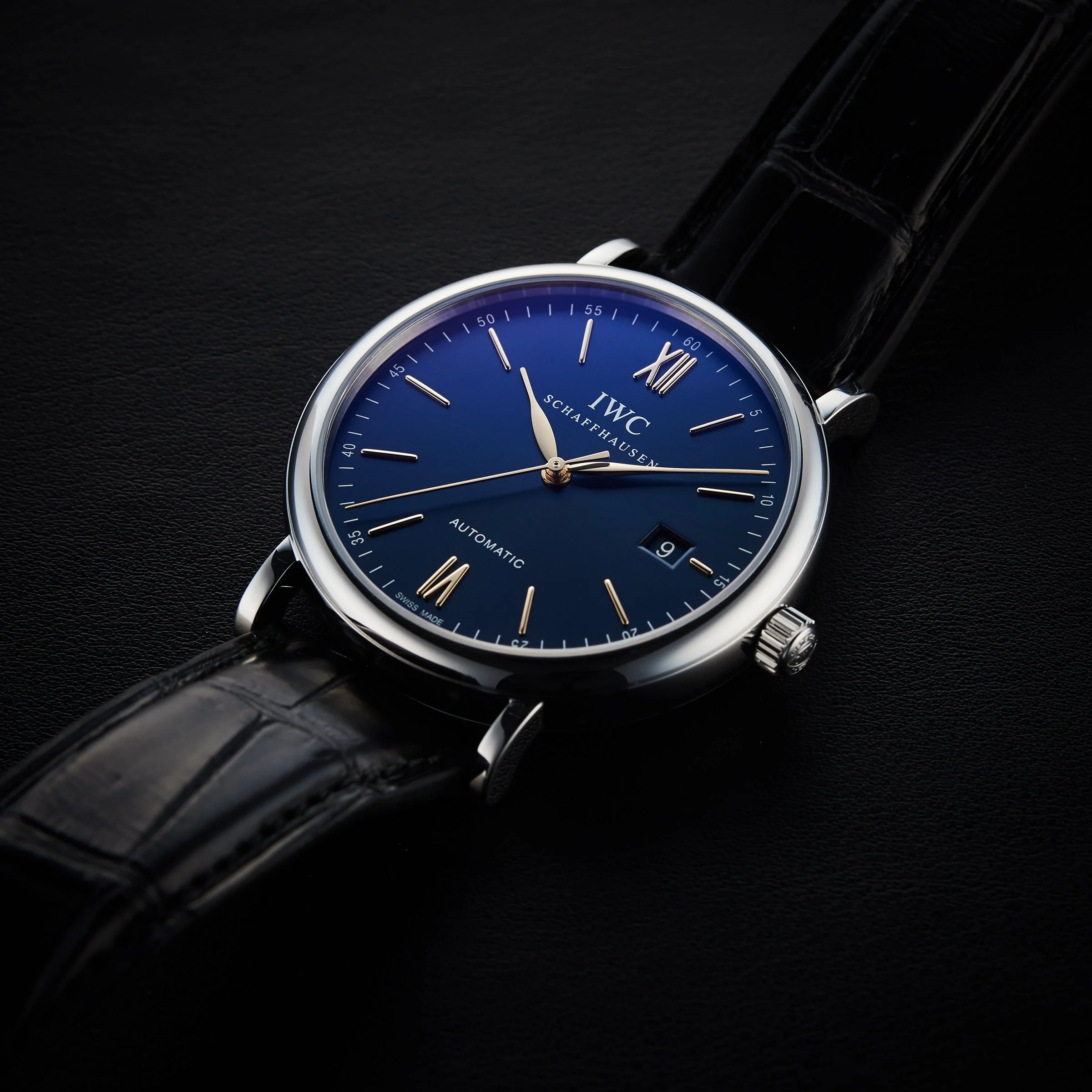Powerful movement meets a laid-back aesthetic Confident and stylish Powered by the 35111 calibre automatic self-winding movement Presented in a 40mm stainless steel case and secured with a black alligator leather strap Water resistant to 3 bar (30m) RELIABLE AND PRECISE Celebrating the IWC Schaffhausen vision of pairing impeccable Swiss precision with cutting edge technology, the Portofino collection blurs the lines between function and form. For over 30 years, the collection has effortlessly encapsulated the laid-back Mediterranean lifestyle with understated luxury. Confident and charming, the Portofino collection has become one of the most popular within the IWC family, showcasing a range of powerful and precise timepieces that radiate sophistication and style. LUXURIOUS DETAILS Timeless and graceful, this 40mm design encompasses a robust stainless steel case, paired with a bold blue dial with rose gold baton hour markers. Bold Roman numerals sit at the 12 and 6 o’clock positions with a discreet date window at 3 o’clock. The case is finished with an AR coating for crystal clear visibility and is perfectly paired with a sleek black alligator style leather strap. Powered by the 35111 calibre automatic self-winding movement, this robust timepiece is water resistant up to 3 bar (30 meters).