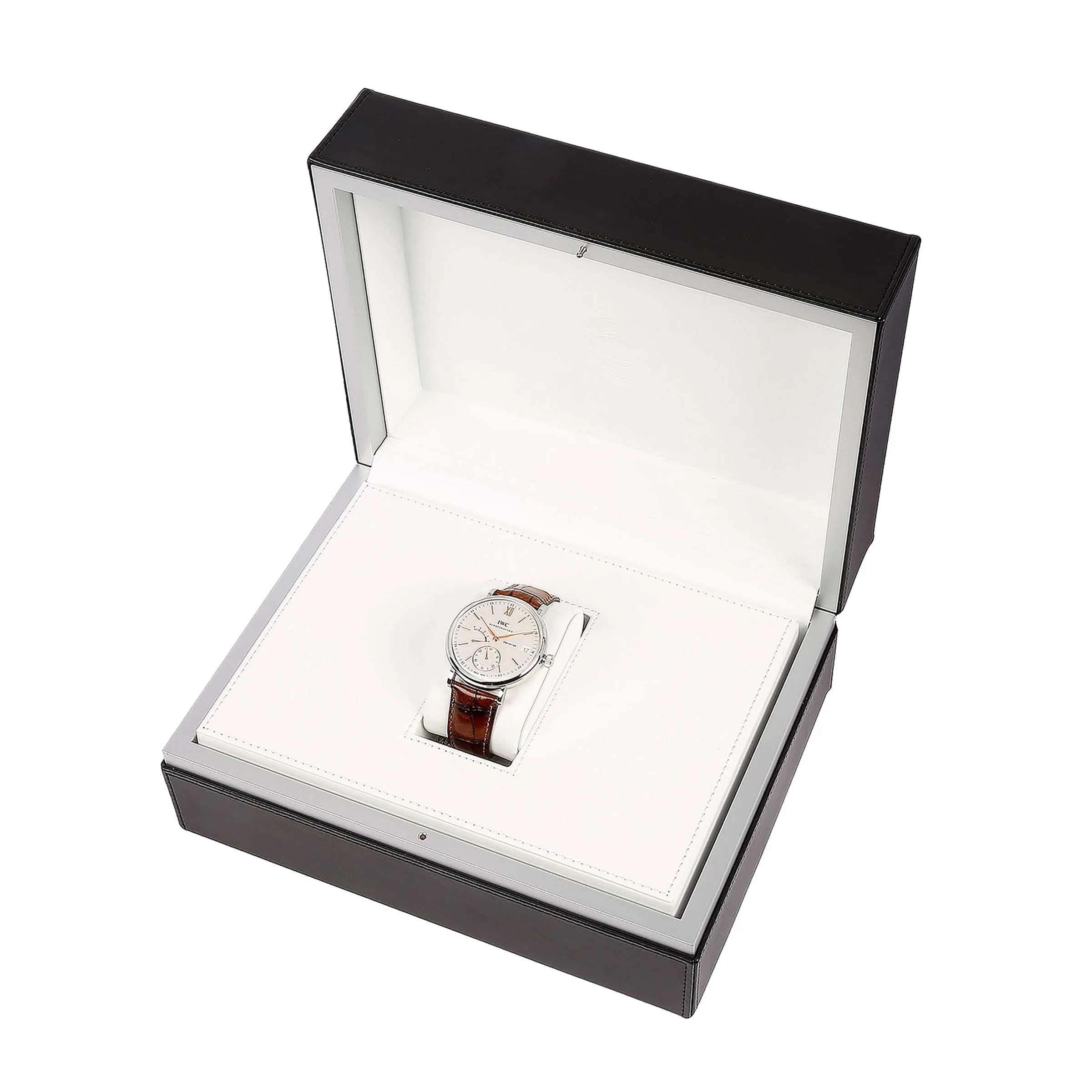The ritual of the hand-wound movement Powered by the IWC-manufactured 59210 calibre movement Presented in a 45mm stainless steel case secured with a brown Santoni alligator style leather strap Water resistant to 3 bar (30m) 8 days of energy storage TRADITION AT ITS CORE Celebrating the IWC Schaffhausen vision of pairing impeccable Swiss precision with cutting edge technology, the Portofino collection takes its design cues from the 1960s, with elegantly sporty push-buttons and chronograph displays.. For over 30 years, the collection has effortlessly encapsulated the laid-back Mediterranean lifestyle with understated luxury. Championing the age-old ritual that comes with classic hand-wound watches, each movement becoming a luxuriously immersive experience. METLICIOUS IN DESIGN The bold 45mm stainless steel case is inspired by flawless Mediterranean design. Precision details on the balanced silver-plated dial include solid gold indices, a seconds display, date display and power reserve display. Powered by the iconic 59210-calibre hand-wound movement, this reliable timepiece is capable of storing 8 days, or 192 hours, worth of energy before being re-wound. The piece is paired with a dark brown, Santoni alligator-style leather strap and is water resistant up to 3 bar (30 metres).
