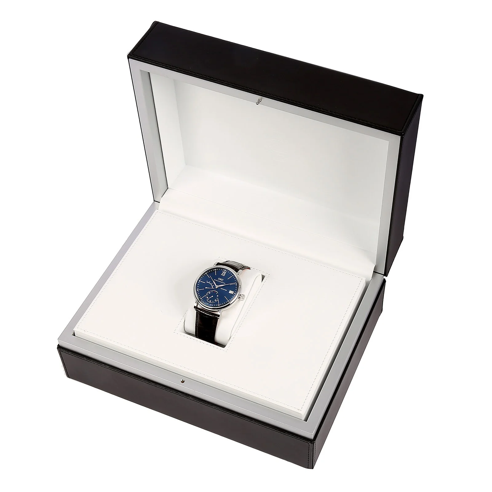 Showcasing a distinctly Mediterranean sense of style, the IWC Portofino collection draws inspiration from the classically stylish and laidback nature of the Italian coast. Designed to deliver exceptional performance, this IWC Portofino Hand-Wound Eight Days Watch is powered by an IWC-manufactured 59210 caliber movement, with an incredible 8-day, or 192-hour, power reserve. Presented within a 45mm stainless steel case, the smart blue dial is equipped with rhodium-plated indices, a power reserve display, a date display at 3 o’clock, small hacking seconds, and a chronograph sub-dial. A transparent case back reveals the inner-workings of this high performance timepiece, while a black alligator leather strap from the House of Santoni completes the look. Water resistant to 30 meters. Explore the full IWC collection.