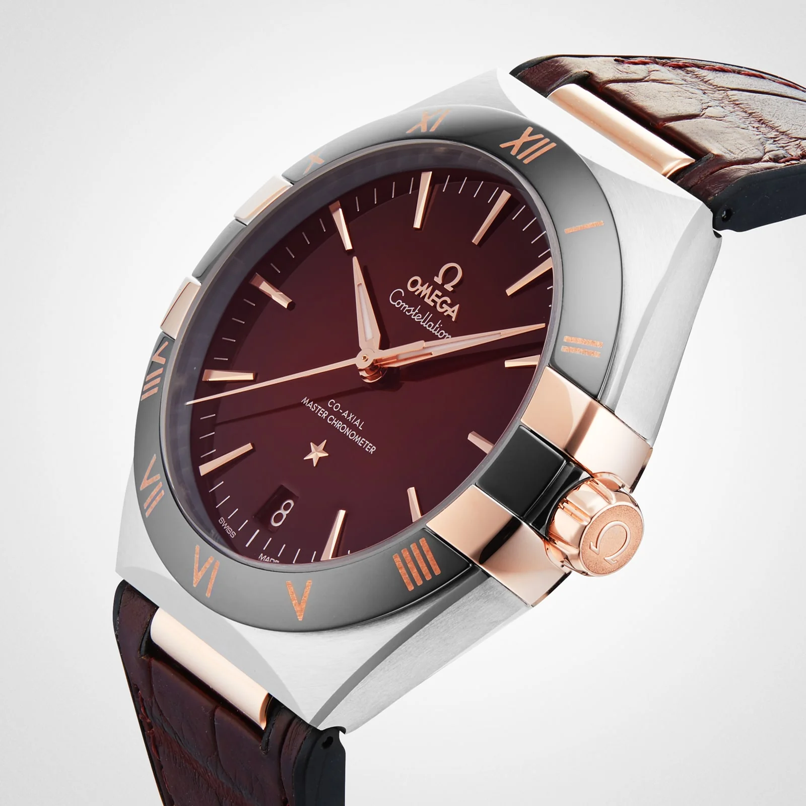 A tribute to Omega’s accomplishments in the 20th century Constellation heritage with the 8900 calibre movement 41mm 18K Sedna™ gold and stainless steel case paired with a burgundy, rubber-lined leather strap Sun-brushed lacquered dial framed by a polished black ceramic bezel Master chronometer certified by METAS A CELEBRATION OF 20TH CENTURY PRECISION Launched in 1952, the iconic Constellation collection was created to pay tribute to Omega’s countless precision accomplishments during the early 20th century. Powered by the brand’s most advanced movements, the striking models in this collection are characterised by dramatic, enduring design. Each model features four claws on the side of the case, half-moon facets, Roman numerals, and a trapezoidal date window beneath a single star. UNIQUE DIAL This 41mm timepiece features an 18K Sedna™ gold and stainless steel case, paired with a burgundy, rubber-lined leather strap. Transitioning from burgundy to black, the sun-brushed dial is lacquered for an unusual, glossy finish, and is framed by a polished, black ceramic bezel with Ceragold™ numerals. Observed through the transparent caseback, the 8900 calibre movement provides flawless precision and performance.