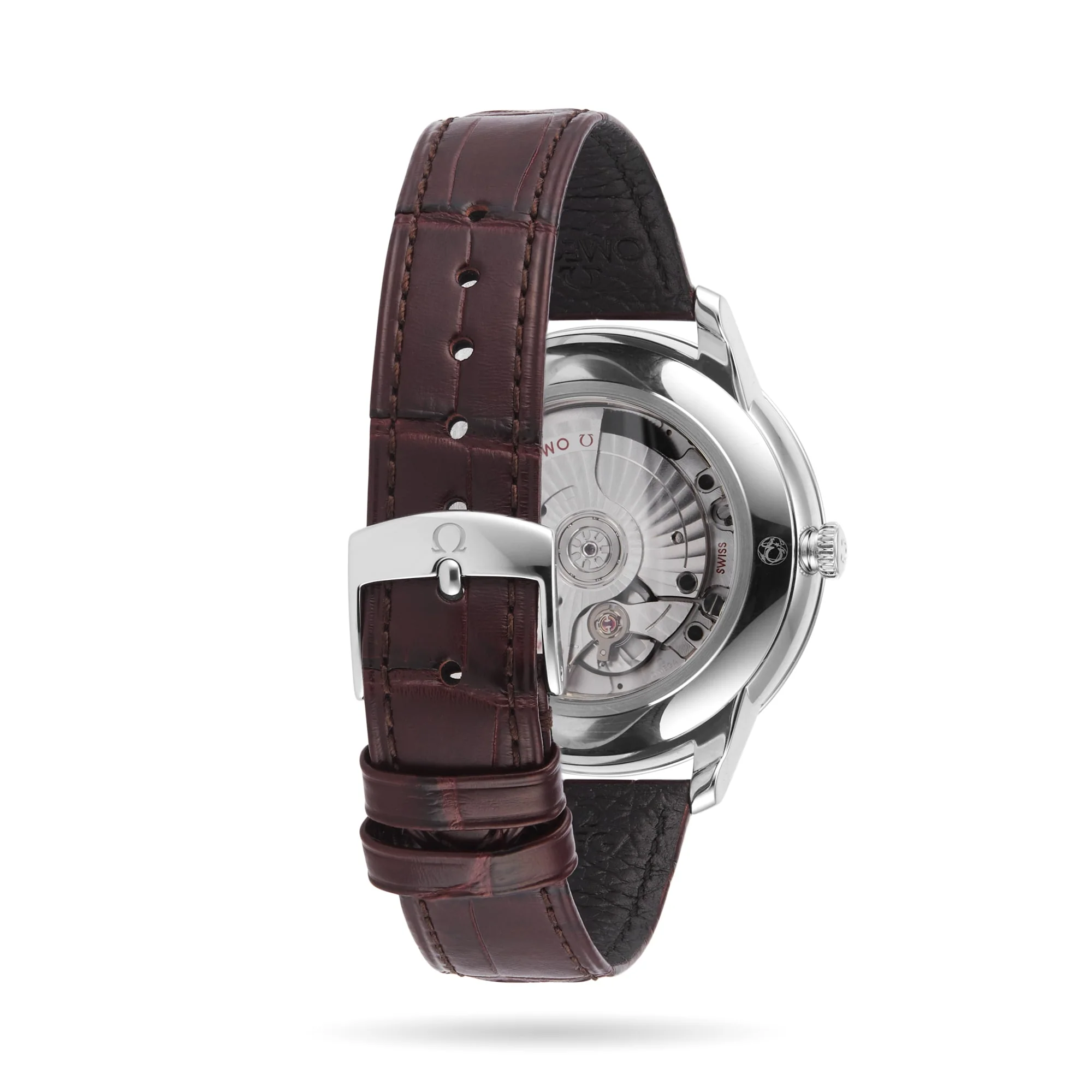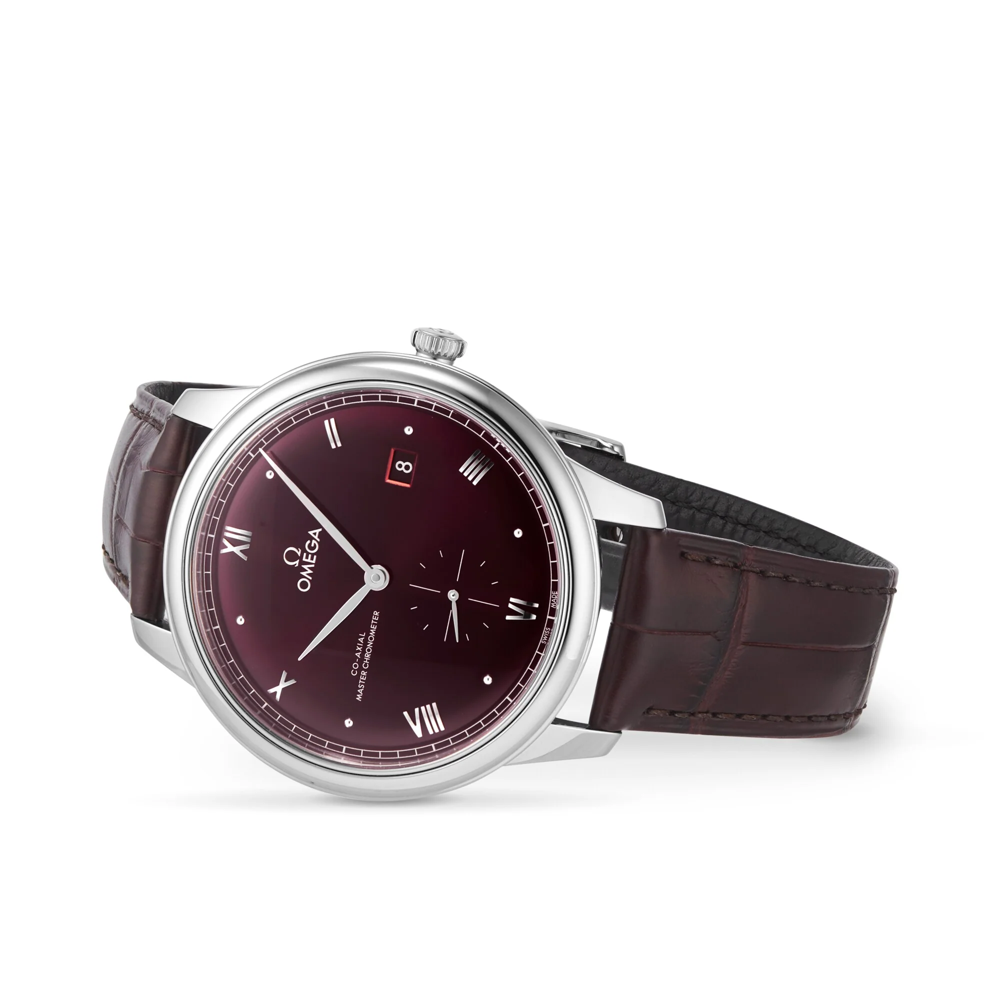 De Ville Prestige - classical design and refined elegance Housed in a 41mm stainless steel case paired with a burgundy leather strap Rich domed PVD wine burgundy dial with a sun-brushed finish Powered by the OMEGA Master Co-Axial Calibre 8802 movement Water resistant to 3 bar (30 metres) CLASSIC DESIGN MEETS REFINED ELEGANCE Commanding a large, loyal following around the globe, the De Ville Prestige collection is world-renowned for its pure, elegant aesthetic. Launched in 1994, the De Ville Prestige collection is a symbol of classical design and refined elegance. The third generation timepieces are distinguished by their slim profile, Master Chronometer certification for mechanical models, and an elevated range of dial colours and finishes to suit all tastes and lifestyles. AN ELEVATED AESTHETIC Housed in a stainless steel case with a burgundy leather strap, this model is driven by the OMEGA Co-Axial Calibre 8802 movement, with a 55-hour power reserve. Rich and inviting, the domed PVD wine burgundy dial features a sun- brushed finish, rhodium-plated hands, alternating Roman numerals and cabochon indexes, and a railway minute track. A date window sits at 3 o'clock while a small seconds sub-dial is located at 6 o'clock. A sapphire crystal case back reveals the movement hard at work within.