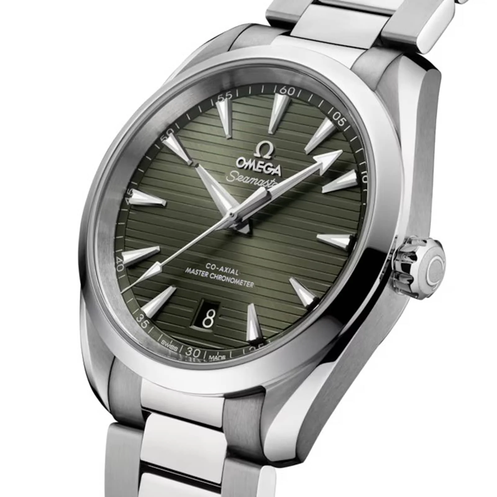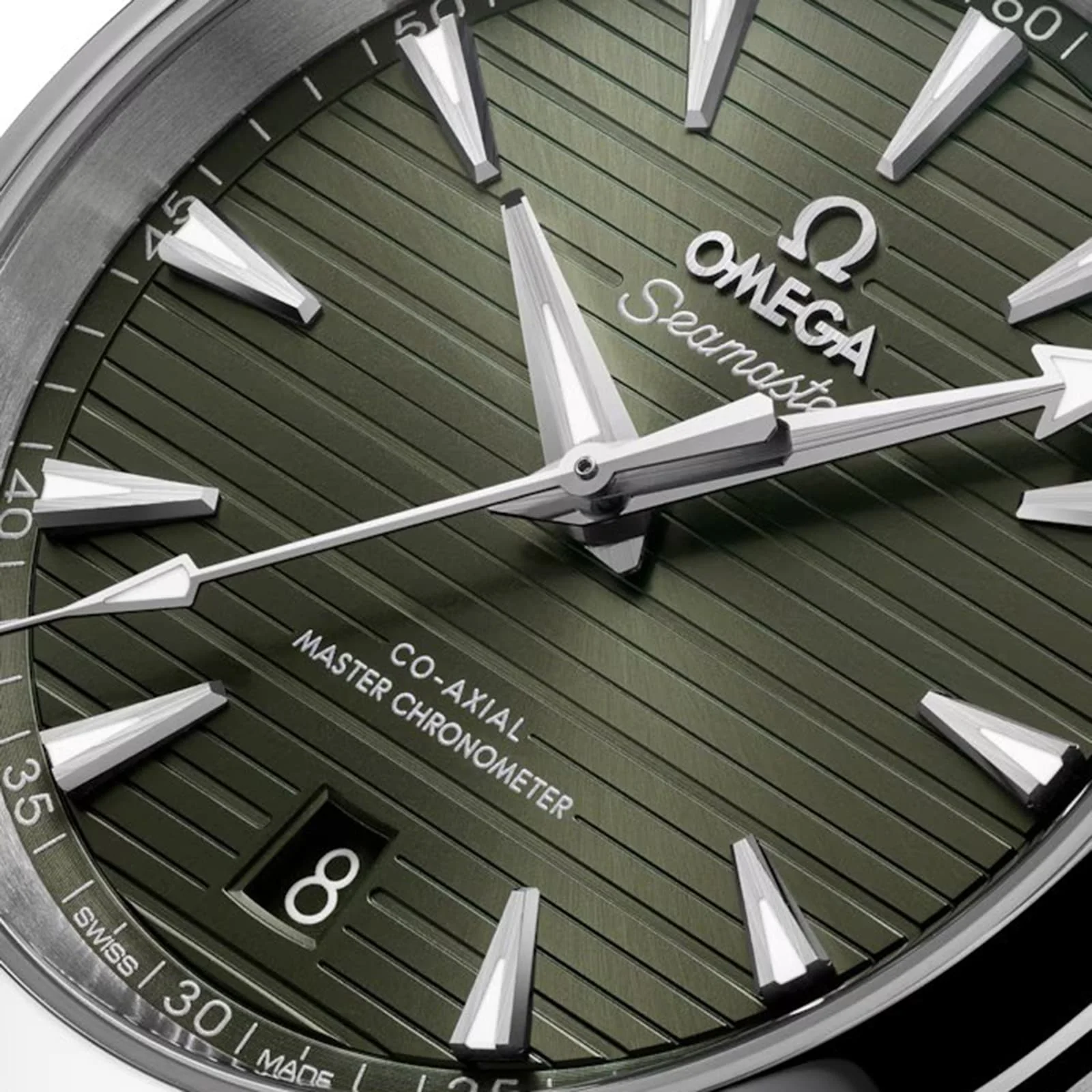 Aqua Terra - a tribute to Omega's rich maritime heritage Built for sporting comfort Water resistant to 15 bar (150 metres) Presented in a 38mm stainless steel case paired with a polished and brushed bracelet Driven by the OMEGA Co-Axial Master Chronometer Calibre 8800 movement A TRUBUTE TO OMEGA'S MARITIME HERITAGE A tribute to Omega's rich maritime heritage, the Seamaster Aqua Terra collection balances technical sophistication and ocean spirit. The 150m models offer a refreshing new look, with clean aesthetics, a new symmetrical case design, and Master Chronometer movements with extraordinary levels of magnetic resistance. These timepieces are further characterised by a patterned dial, inspired by the wooden decks of luxury boats. INSPIRED BY SAILBOATS Smart and sophisticated with a sporting edge, this 38mm stainless steel watch is housed in a symmetrical case with a matching bracelet and a wave-edged designed on the back. The green PVD dial features a sun-brushed finish and the iconic Aqua Terra stripes, inspired by the wooden decks of sailboats. A date window at 6 o'clock and rhodium-plated hands and indexes filed with white Super-LumiNova add further functionality. This high performance model is driven by the OMEGA Master Chronometer calibre 8800 movement, with a 55- hour power reserve.
