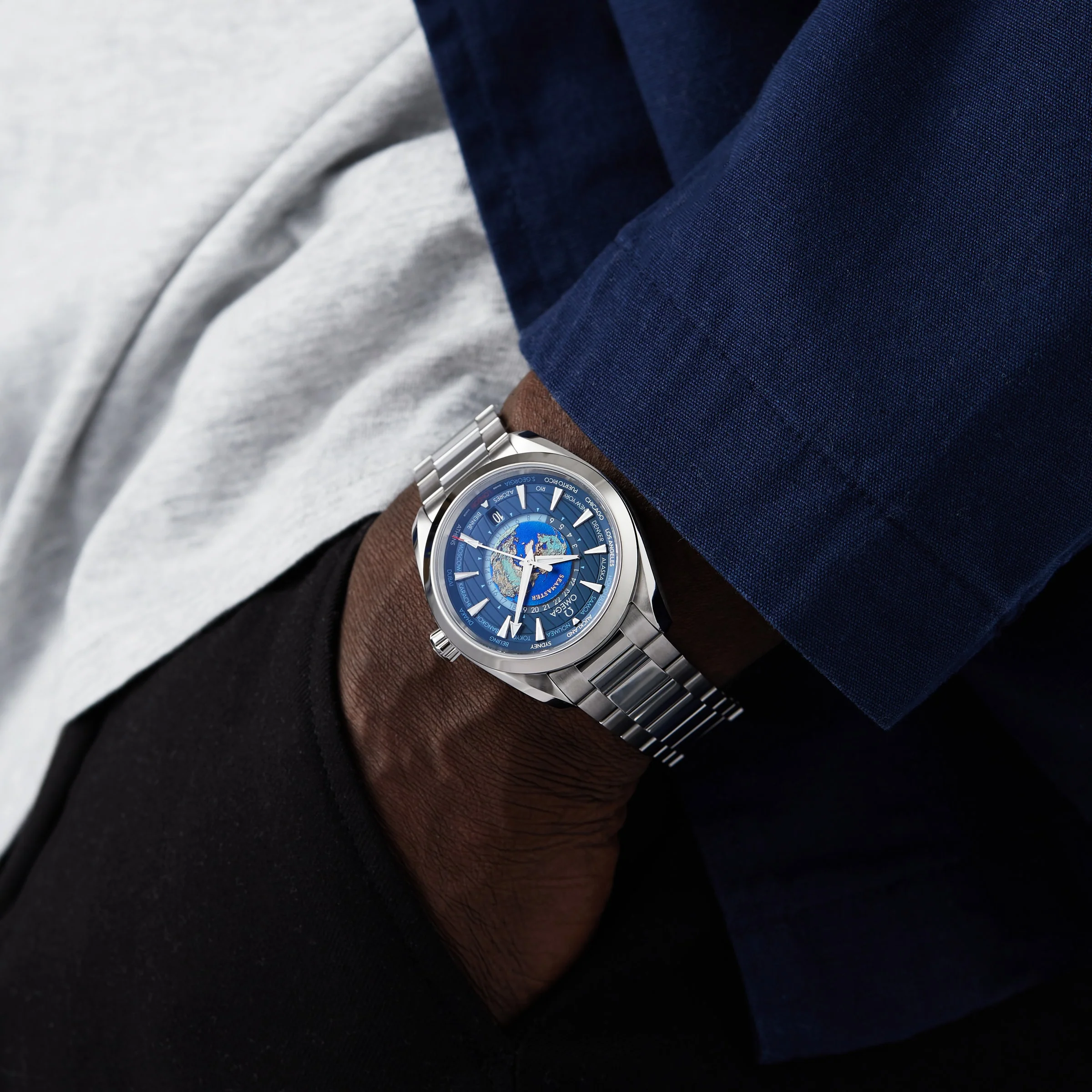Keep track of time anywhere in the world Seamaster heritage with the 8938 calibre movement 43mm polished stainless steel case paired with a stainless steel bracelet 24-hour glass ring indicating day and night Water resistant to 15 bar (150 metres) A TRULY GLOBAL MODEL Keep track of time wherever you are in the world with the Omega Seamaster Aqua Terra Worldtimer collection. This unique collection presents the teak-patterned dials seen elsewhere in the Aqua Terra collection, with the addition of a truly international influence. International destinations are listed around the dial, including the brand’s hometown of Biel. At the very heart of the dial, the planet Earth is depicted via a cutting-edge view of the continents, achieved with advanced laser-ablation technology on a Grade 5 titanium plate. TRACK TIME AROUND THE WORLD This 43mm timepiece features a polished stainless steel case paired with a stainless steel bracelet. The impressive, sun-brushed blue dial features a circle of global destinations printed in different colours to indicate different time zones. At the centre of the dial sits a 24-hour glass ring, with light blue to indicate daytime and dark blue to indicate night. This international chronograph is powered by an 8938 calibre movement for the ultimate precision, wherever you are in the world.