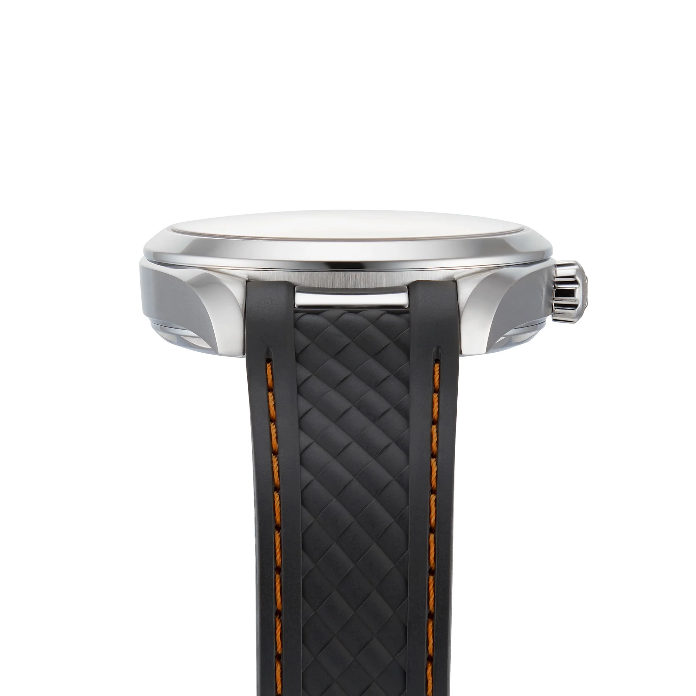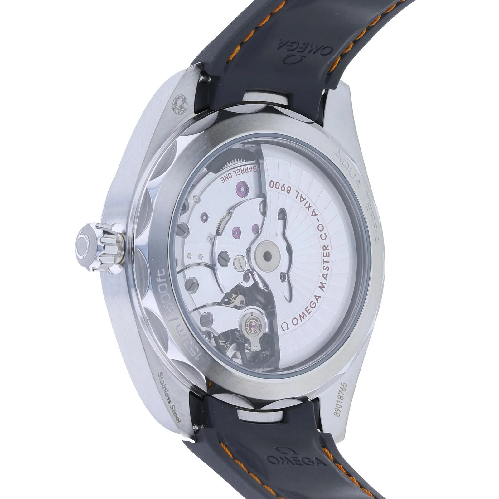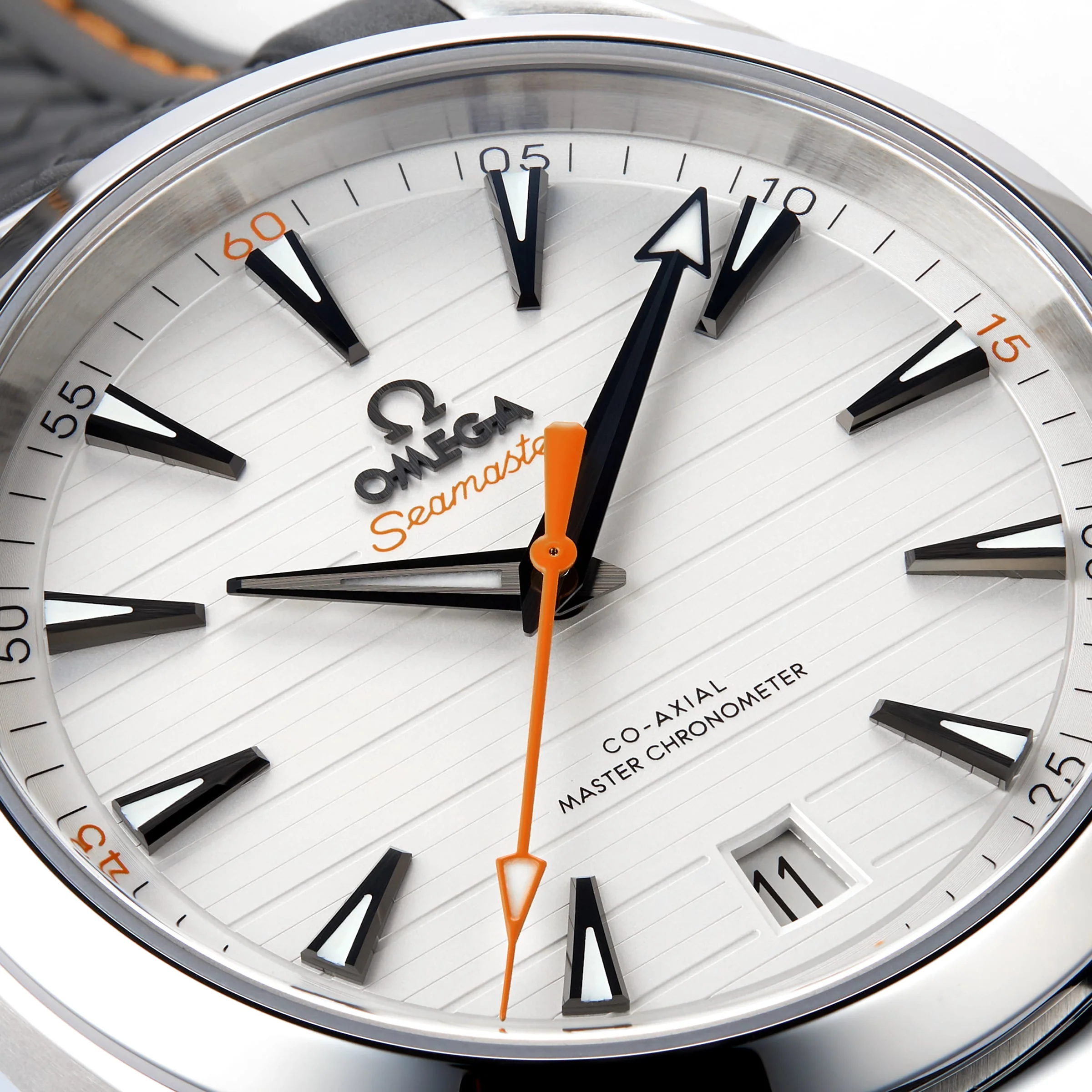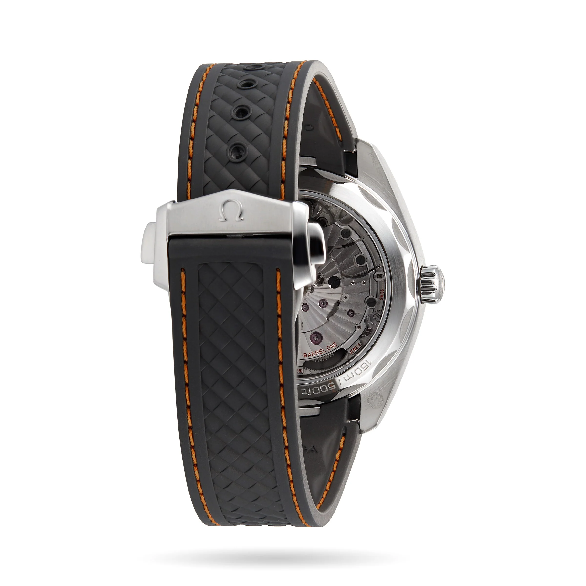 A tribute to OMEGA’s maritime spirit Seamaster heritage powered by the 8900 calibre movement 41mm stainless steel case presented on a grey, structured rubber strap Water resistant to 15 bar (150 meters) Master Chronometer officially certified by METAS INSPIRED BY THE OCEAN A tribute to Omega’s rich maritime heritage, the Seamaster Aqua Terra collection balances technical sophistication and ocean spirit. The 150m models offer a refreshing new look, with clean aesthetics, a new symmetrical case design, and Master Chronometer movements with extraordinary levels of magnetic resistance. These timepieces are further characterised by a patterned dial, inspired by the wooden decks of luxury boats. ICONIC FEATURES This 41mm watch features a stainless steel, symmetrical case with a silver-tone dial and transparent caseback. Made with structured rubber, lined with grey with orange stitching, the integrated strap provides a distinctly nautical feel, while the self-locking crown used by divers, provides impeccable water resistance. The blackened hands and indexes are filled with white Super-LumiNova, with a striking orange central seconds hand and iconic “Seamaster” wording. Orange is also used to highlight the four quarter numbers on the minute track. Certified to the highest industry standards by the Swiss Federal Institute of Metrology (METAS) for accuracy and precision on land or at sea.