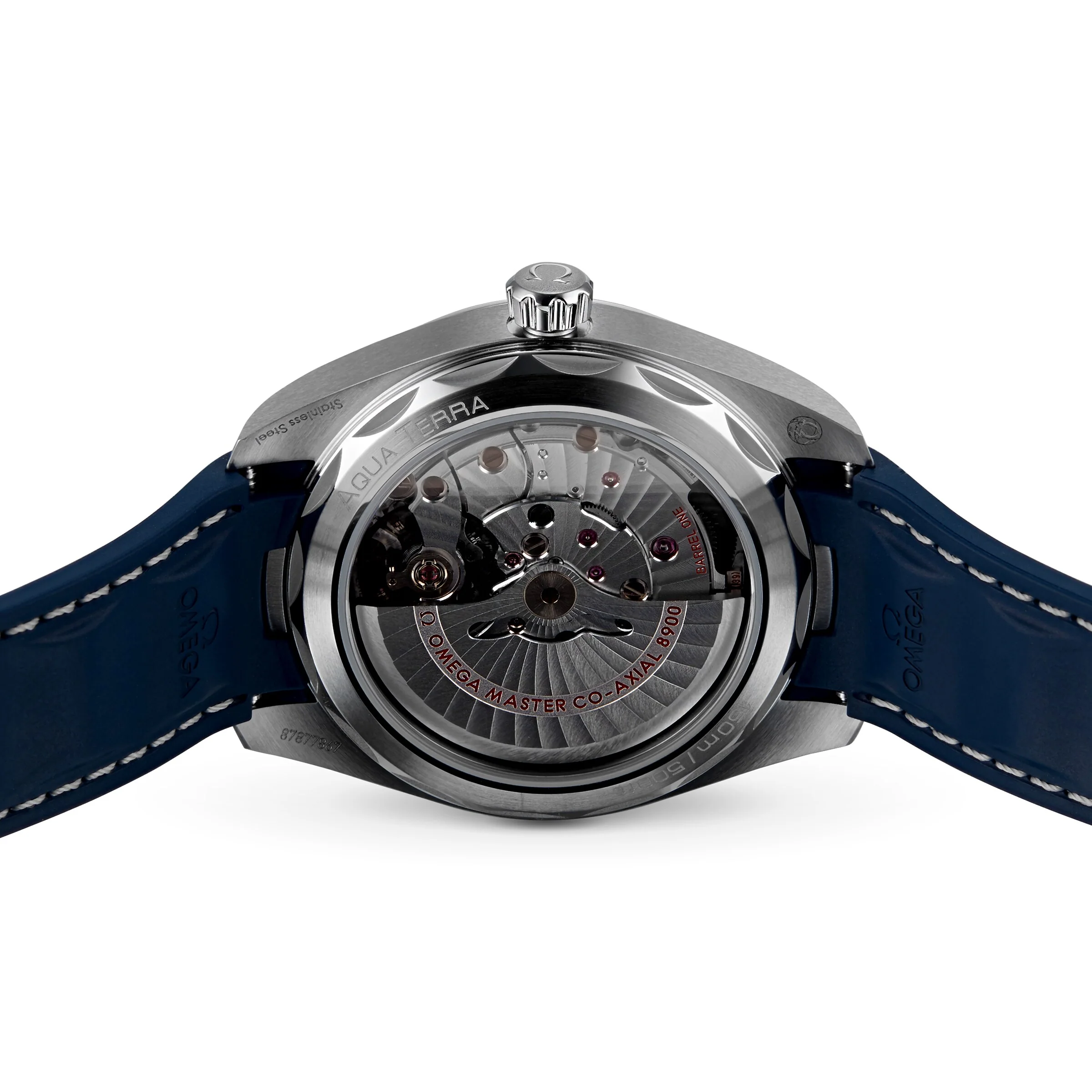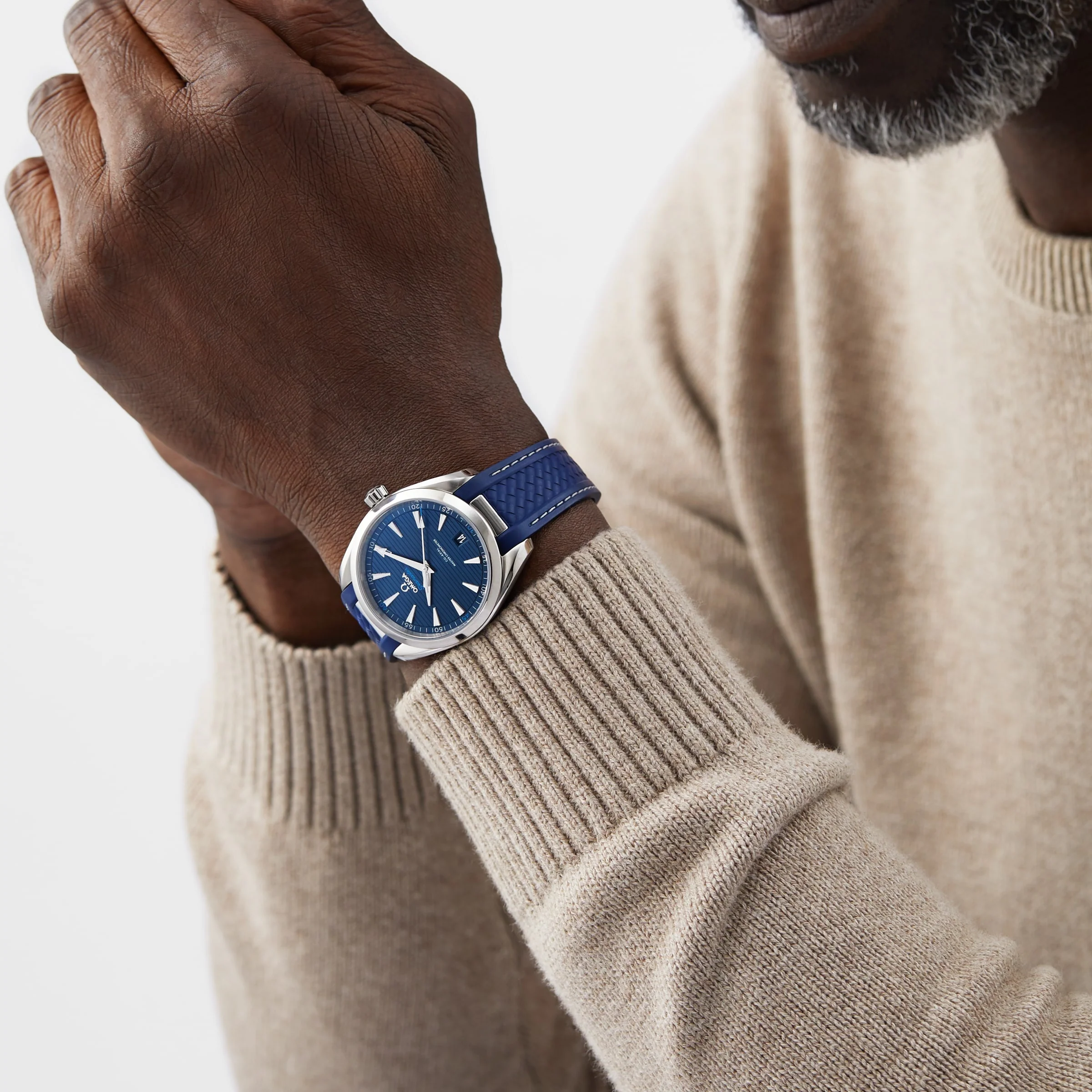 A tribute to Omega’s rich maritime heritage Seamaster heritage with 8900 calibre movement Water resistant to 15 bar (150 metres) 41mm stainless steel case paired with a blue structured rubber strap Master chronometer certified by METAS SOPHISTICATED OCEAN SPIRIT A tribute to Omega’s rich maritime heritage, the Seamaster Aqua Terra collection balances technical sophistication and ocean spirit. The 150m models offer a refreshing new look, with clean aesthetics, a new symmetrical case design, and Master Chronometer movements with extraordinary levels of magnetic resistance. These timepieces are further characterised by a patterned dial, inspired by the wooden decks of luxury boats. DISTINCT DESIGN This 41mm timepiece is presented in a symmetrical, stainless steel case, paired with a structured rubber stap, with a grey lining. The black dial features a date window at 6 o’clock, replicating the first Omega watch with a date window, released in 1952. The maritime influence can also be seen in the wave-edged design on the caseback. Power and precision are delivered by the 8900 calibre movement, with magnetic field resistance to 15,000 gauss.