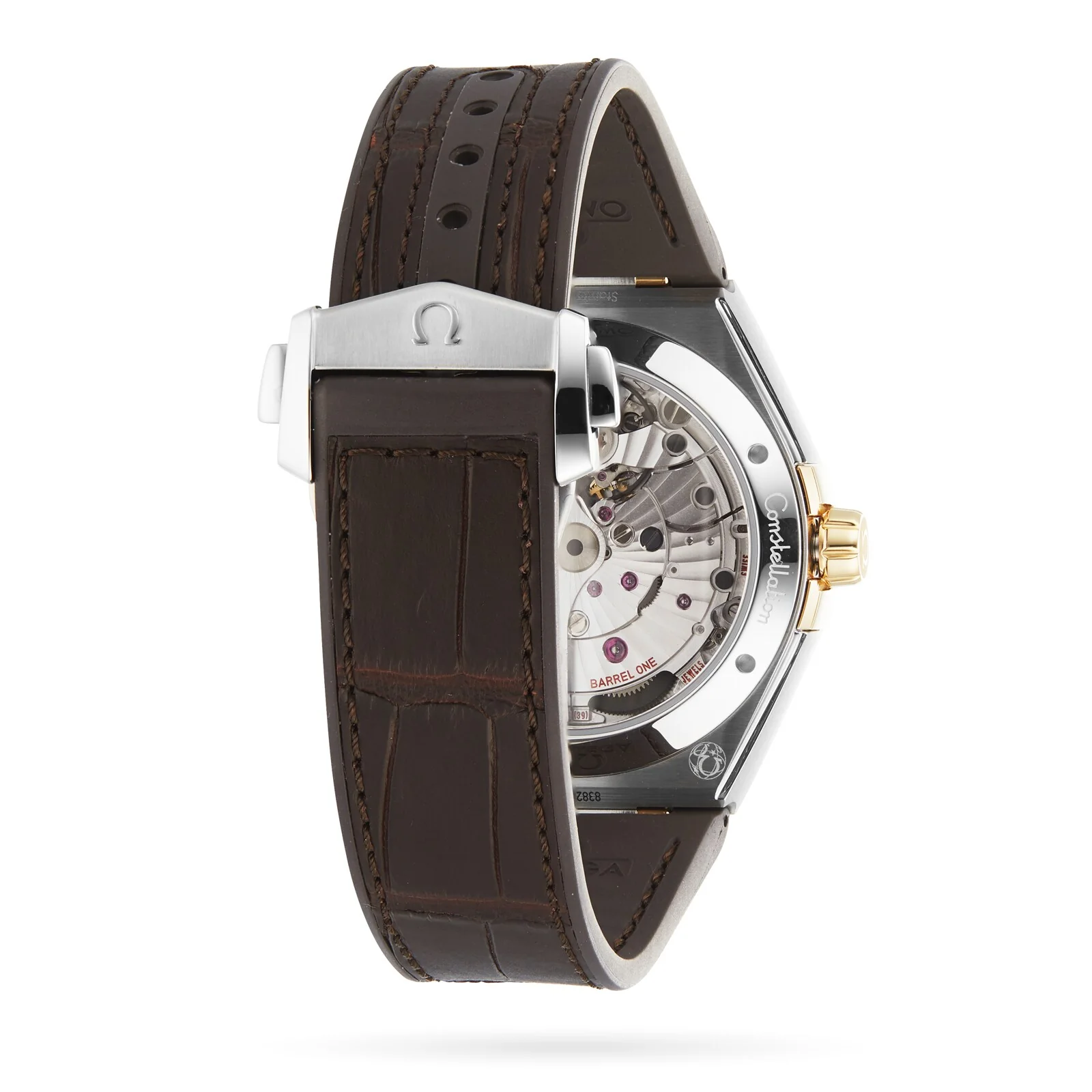 A tribute to Omega’s accomplishments in the 20th century Constellation heritage with the 8900 calibre movement 41mm 18K yellow gold and stainless steel case paired with a brown, rubber-lined leather strap Rhodium-grey dial framed by a polished brown ceramic bezel with Ceragold™ numerals Master chronometer certified by METAS A TRIBUTE TO 20TH CENTURY PRECISION Launched in 1952, the iconic Constellation collection was created to pay tribute to Omega’s countless precision accomplishments during the early 20th century. Powered by the brand’s most advanced movements, the striking models in this collection are characterised by dramatic, enduring design. Each model features four claws on the side of the case, half-moon facets, Roman numerals, and a trapezoidal date window beneath a single star. STRIKING DIAL This 41mm timepiece features an 18K yellow gold and stainless steel case, paired with a brown, rubber-lined leather strap. With a silk-embossed finish, the rhodium-grey dial features 18K yellow gold hands and hour markers, and is framed by a polished, brown ceramic bezel with Ceragold™ Roman numerals. Visible through the transparent caseback, the 8900 calibre movement provides flawless precision and impeccable performance.