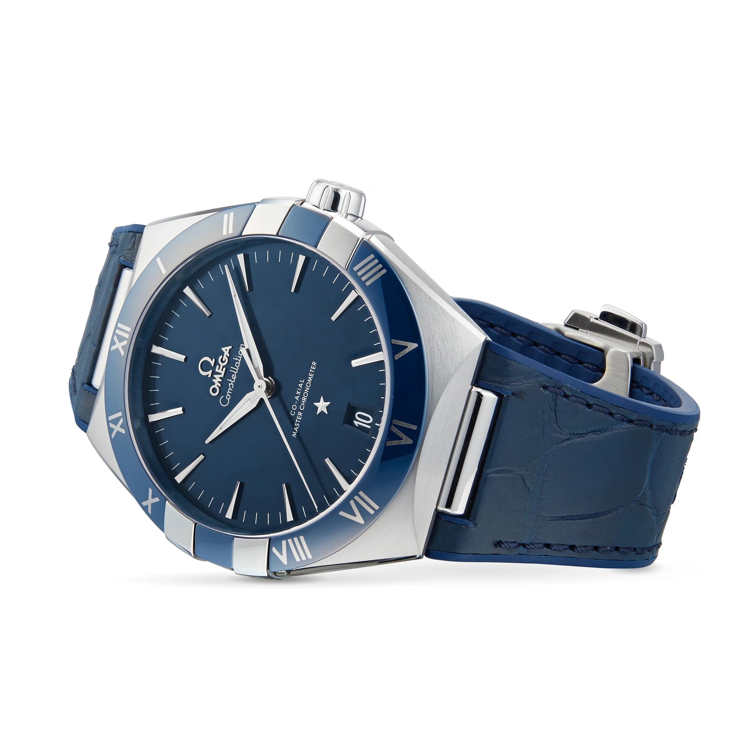 A tribute to Omega’s accomplishments in the 20th century Constellation heritage with the 8900 calibre movement 41mm stainless steel case paired with a blue, rubber-lined leather strap Sun-brushed blue dial framed by a polished blue ceramic bezel Master chronometer certified by METAS A TRIBUTE TO OMEGA’S 20TH CENTURY ACHIEVEMENTS Launched in 1952, the iconic Constellation collection was created to pay tribute to Omega’s countless precision accomplishments during the early 20th century. Powered by the brand’s most advanced movements, the striking models in this collection are characterised by dramatic, enduring design. Each model features four claws on the side of the case, half-moon facets, Roman numerals, and a trapezoidal date window beneath a single star. ADVANCED PRECISION This 41mm timepiece features a stainless steel case, paired with a deep blue, rubber-lined leather strap. The sun-brushed blue dial is framed by a polished, blue ceramic bezel with Liquidmetal Roman numerals. Driven by the 8900 calibre movement for exceptional precision and performance.